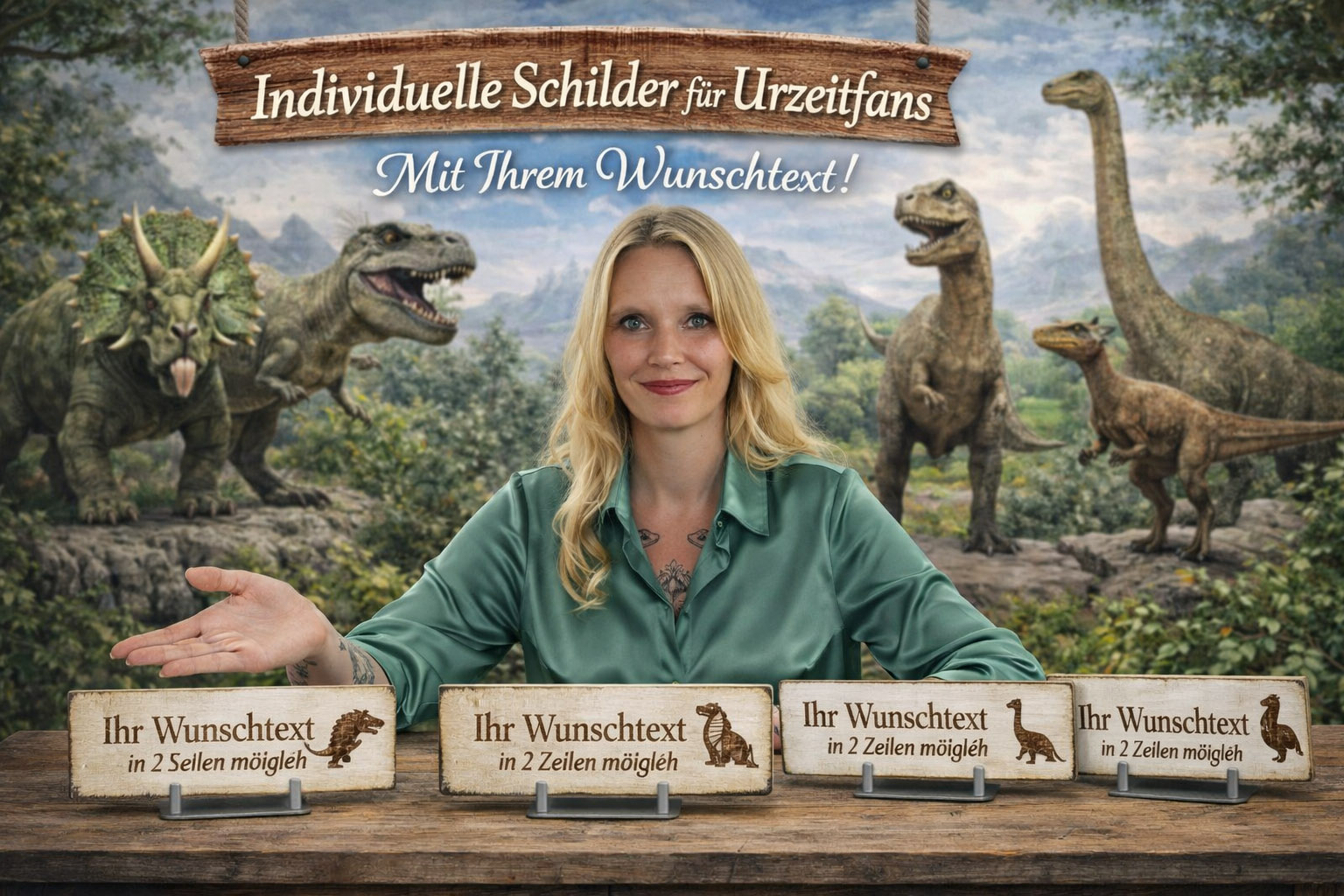 Die Motive zeigen verschiedene Dinosaurier und Urzeittiere, die mit feinen Linien detailreich in das Material graviert werden. Ob beeindruckende Raubsaurier, friedliche Pflanzenfresser oder andere bekannte Urzeitbewohner – die Gravuren verleihen dem Schild einen spannenden und zugleich dekorativen Charakter.