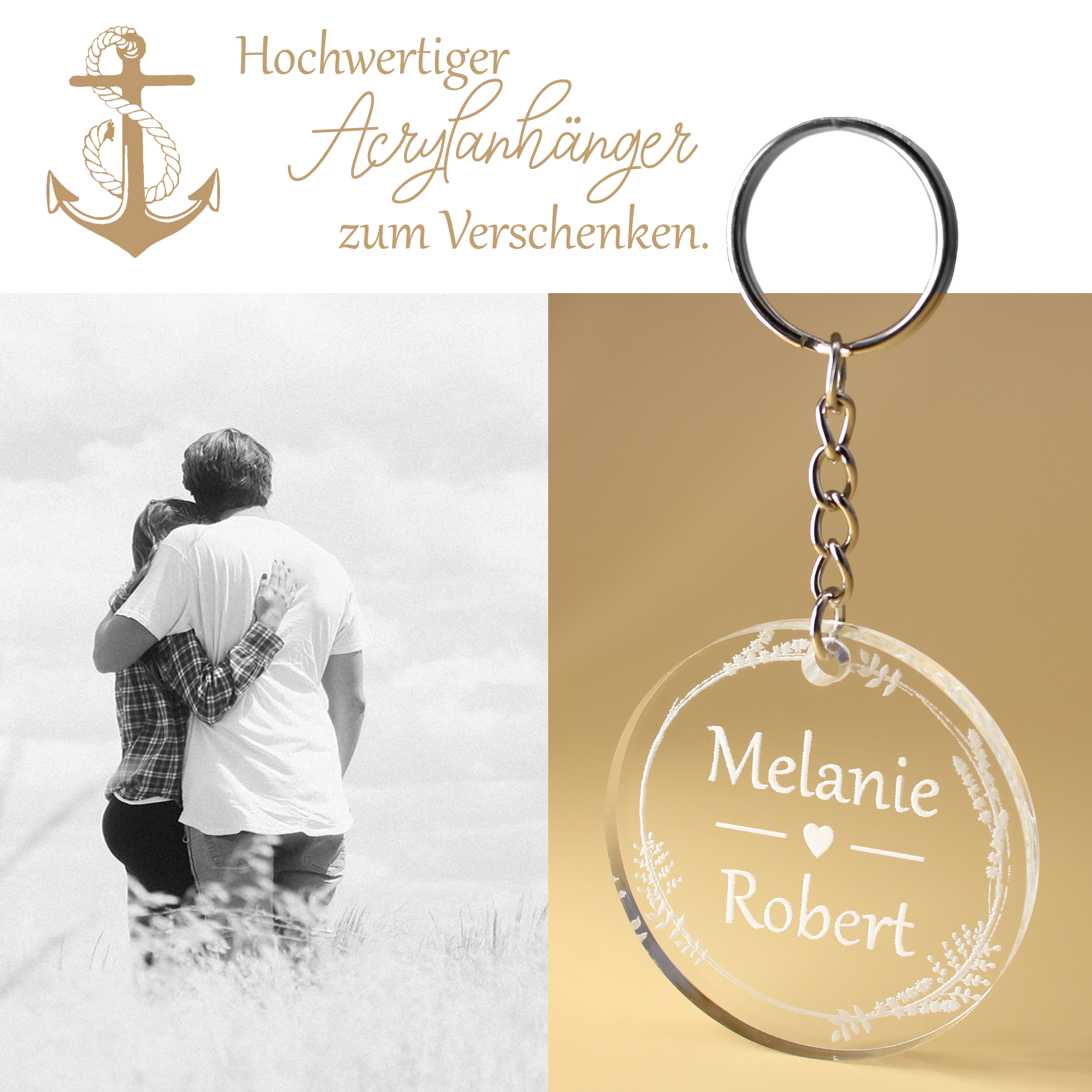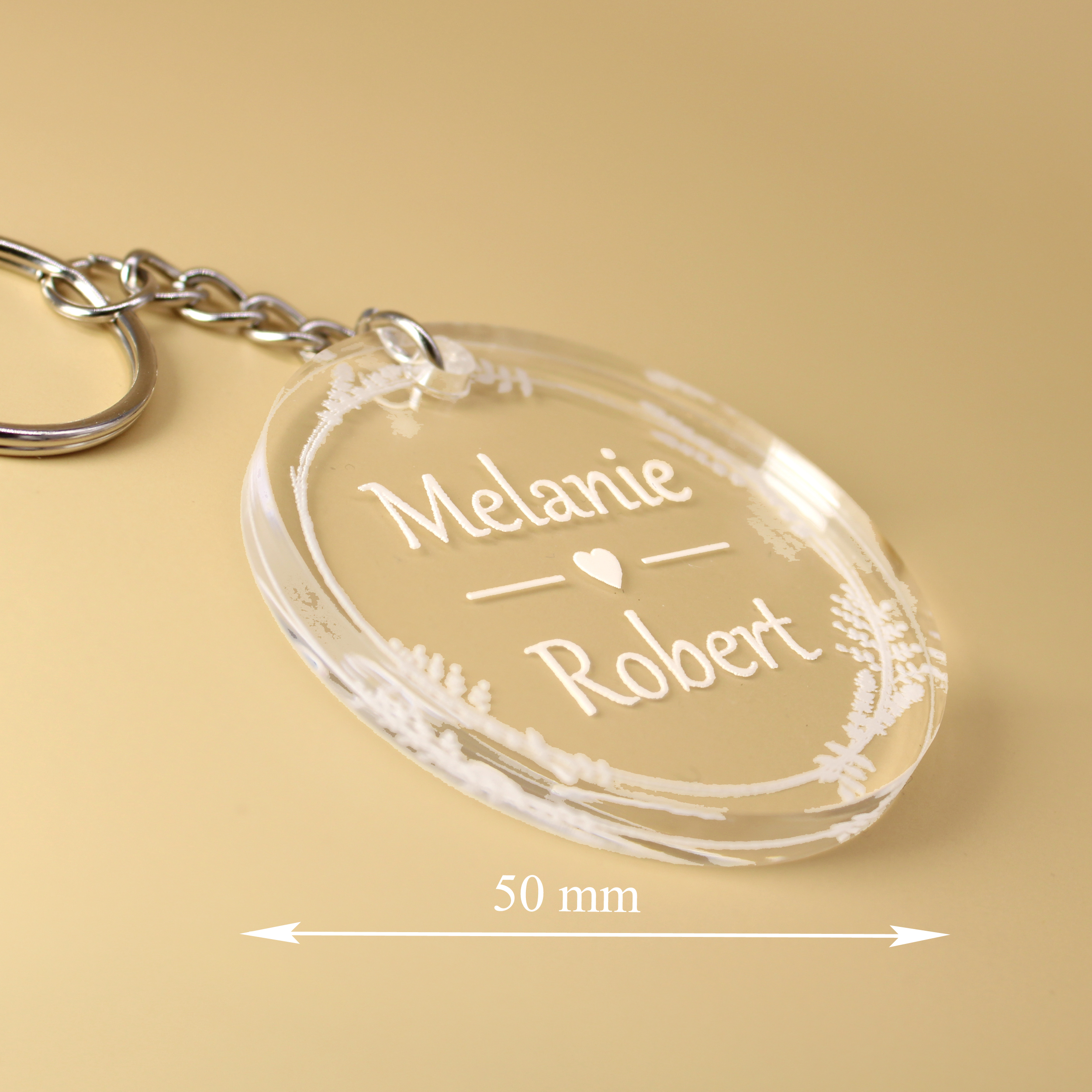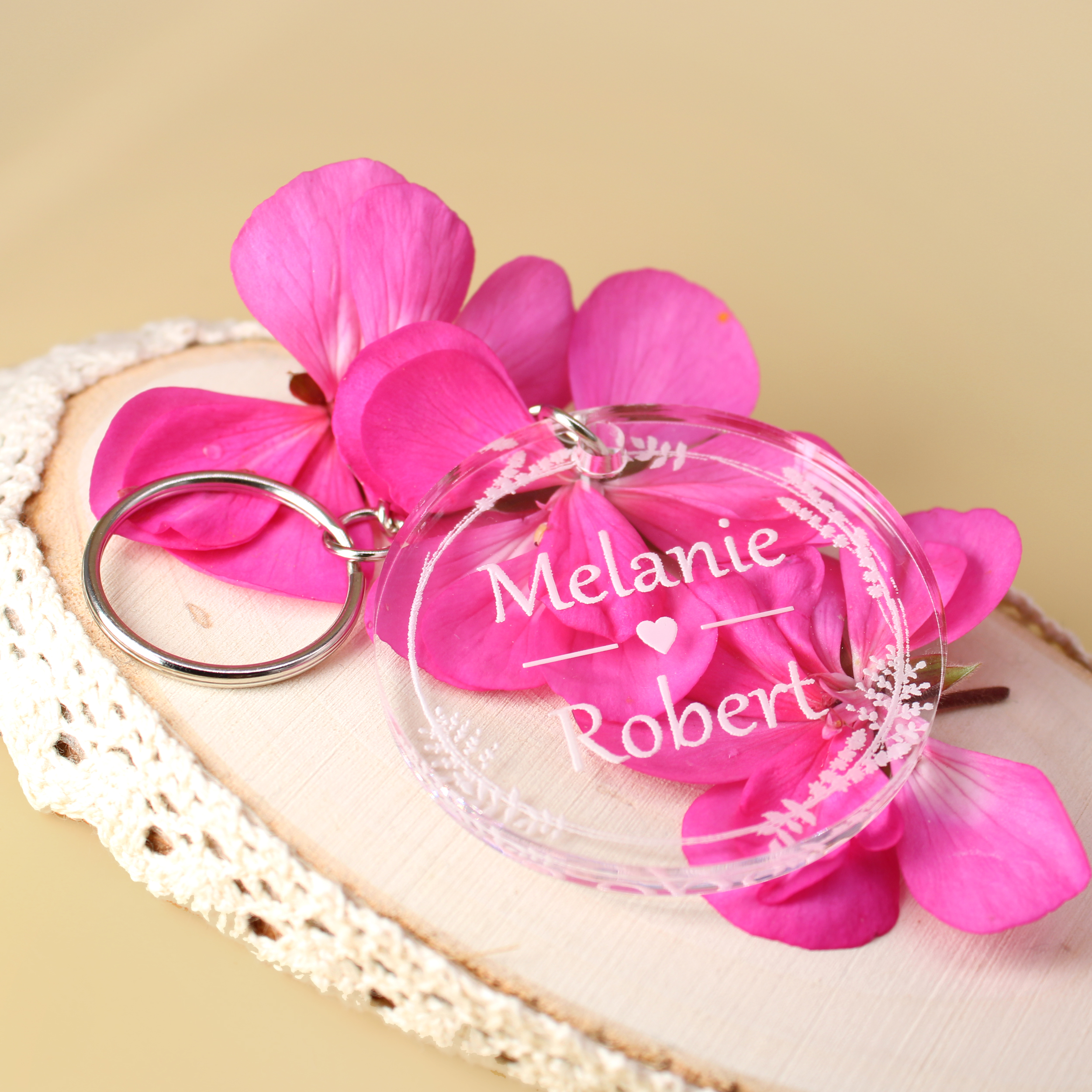 - Schlüsselanhänger aus Acryl für Hochzeit 5x5 cm – runder Acrylanhänger mit weißer Gravur und personalisierbar mit zwei Namen– perfektes Hochzeitsgeschenk oder Paar-Geschenk.
