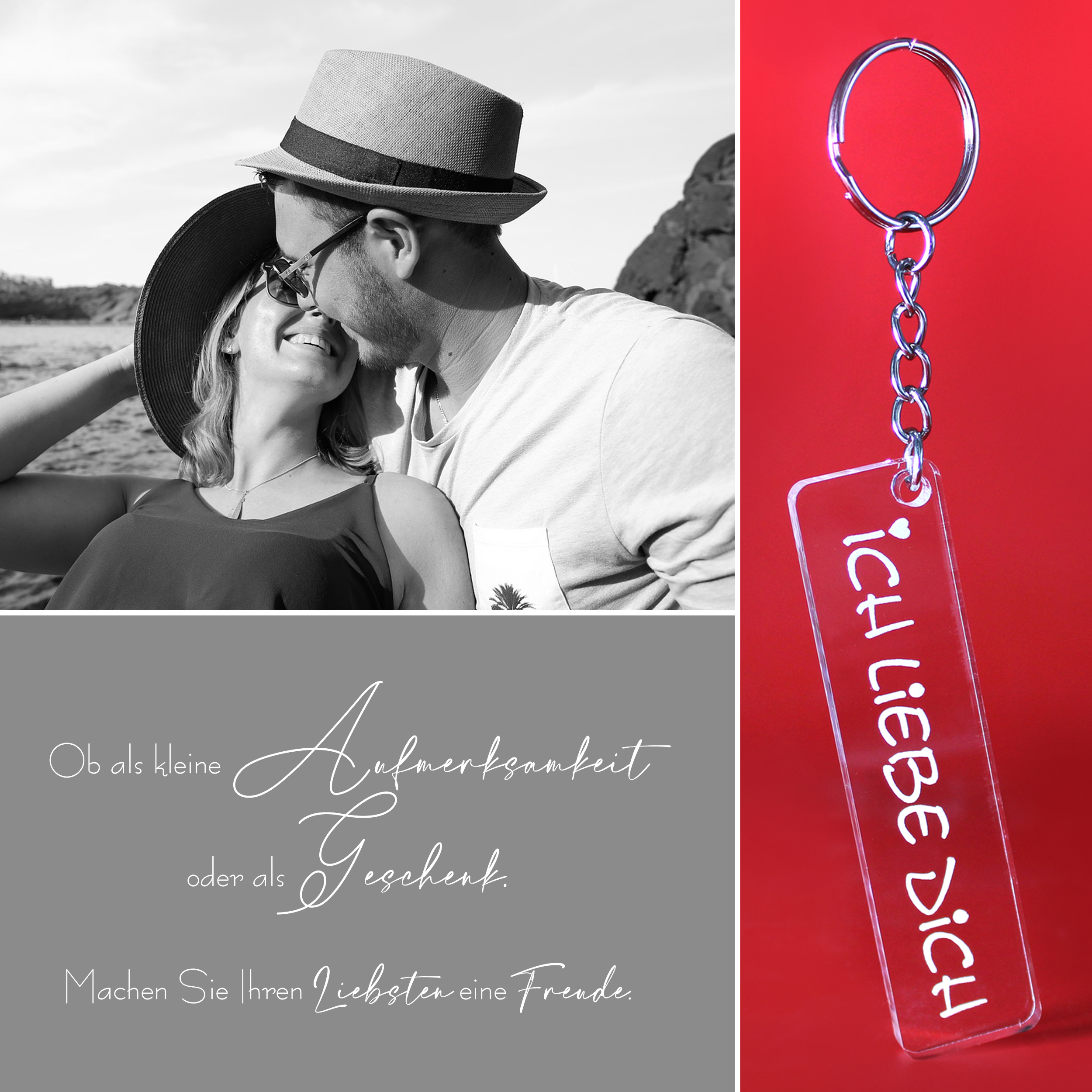 Dieser hochwertige Schlüsselanhänger aus klarem Acryl mit der liebevollen Gravur „Ich liebe dich“ ist ein kleiner, aber bedeutungsvoller Alltagsbegleiter. Mit seinem minimalistischen Design und dem kleinen Herzsymbol eignet er sich perfekt als Geschenk für den Partner, die Partnerin, beste Freunde oder Familienmitglieder.