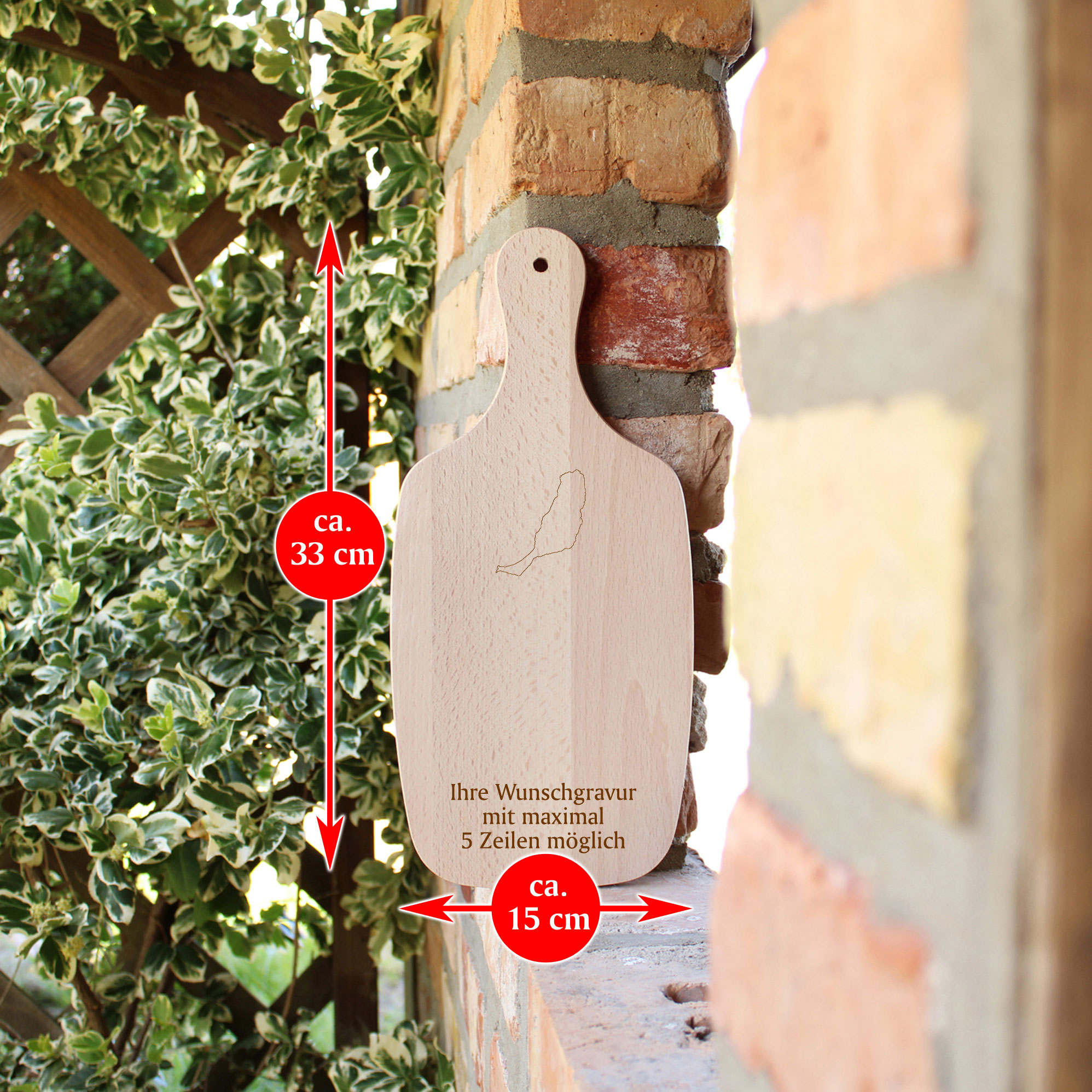 - IDIALE GRÖSSE - Das Küchenbrett mit Gravur ist perfekt für das Frühstück und Abendessen mit der Familie. Mit den Maßen 33 x15 cm ist das Brotbrett nicht zu klein und nicht zu groß, auf dem Holzschneidebrett genug Platz und der schön geformte Griff inkl. Bohrung lässt das Brotzeitbrett sehr gut in der Hand liegen und verstauen