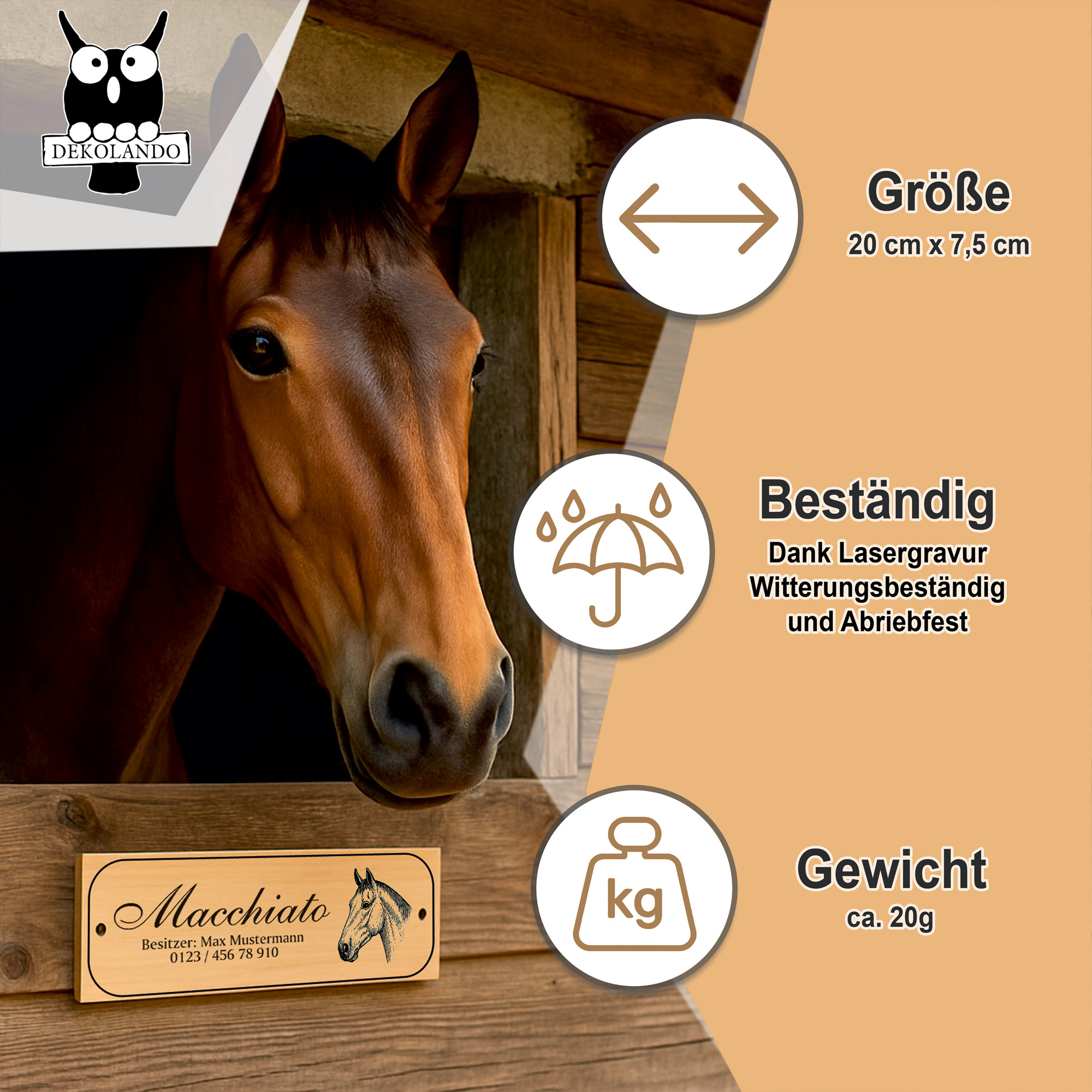 Die linke Schildhälfte bietet Platz für eine große Namenszeile sowie bis zu zwei Zusatzzeilen. So können beispielsweise Pferdename, Besitzername, Boxennummer oder Stallinformationen individuell eingraviert werden. Auf der rechten Seite befindet sich eine fein gezeichnete Pferdekopf-Illustration, die dem Schild einen edlen, persönlichen Charakter verleiht.