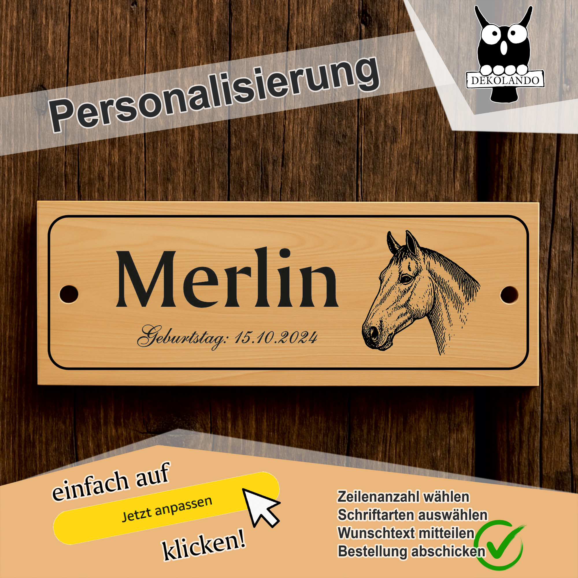 - Personalisiertes Stallschild mit Pferdekopf – Hochwertiges Schild im Querformat (20×7,5 cm) mit individueller Beschriftung in bis zu 3 Zeilen. Ideal als Namensschild für Pferdebox, Stall oder Paddock.