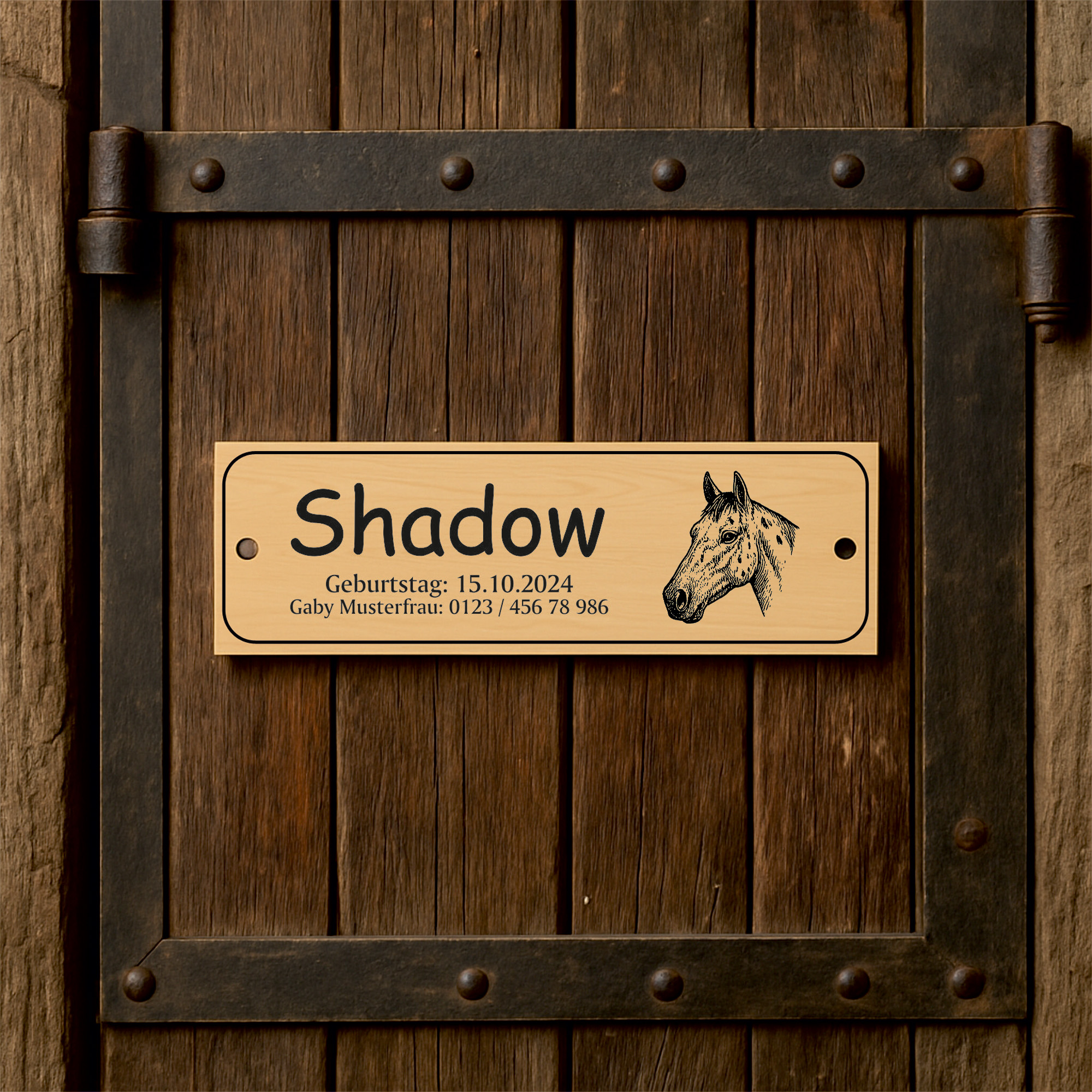 Die linke Schildhälfte bietet Platz für eine große Namenszeile sowie bis zu zwei Zusatzzeilen. So können beispielsweise Pferdename, Besitzername, Boxennummer oder Stallinformationen individuell eingraviert werden. Auf der rechten Seite befindet sich eine fein gezeichnete Pferdekopf-Illustration, die dem Schild einen edlen, persönlichen Charakter verleiht.