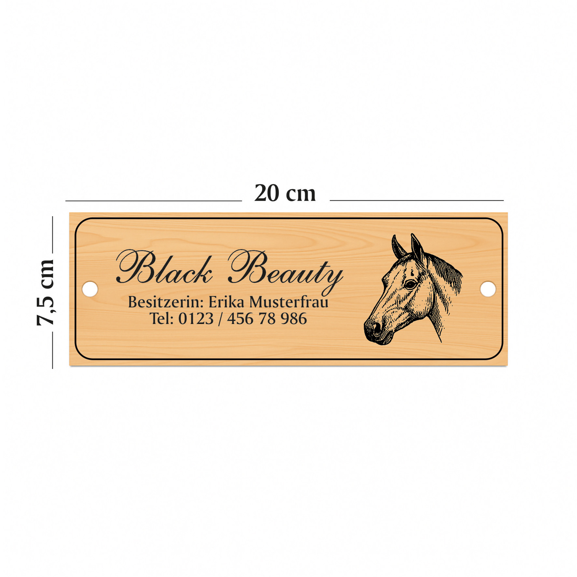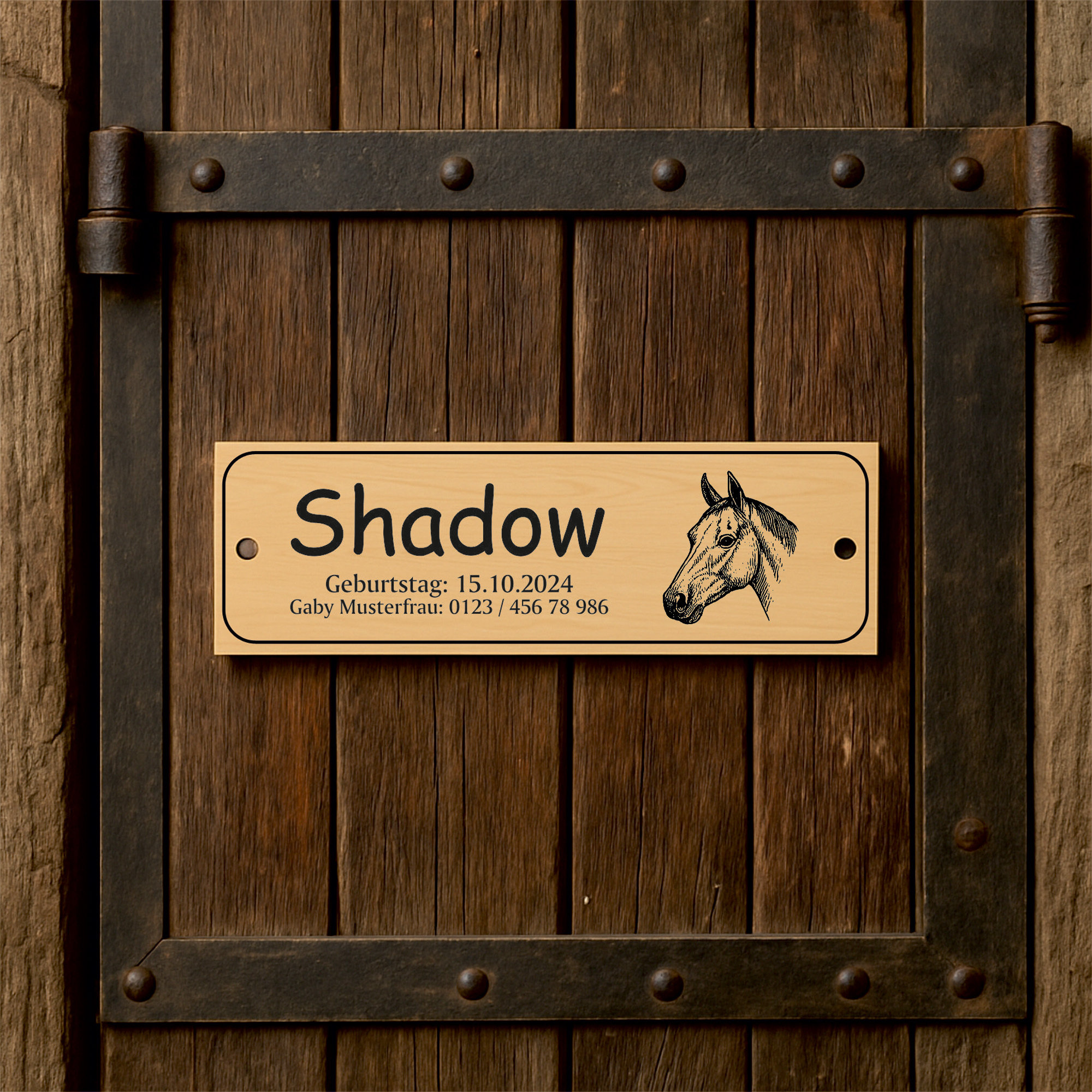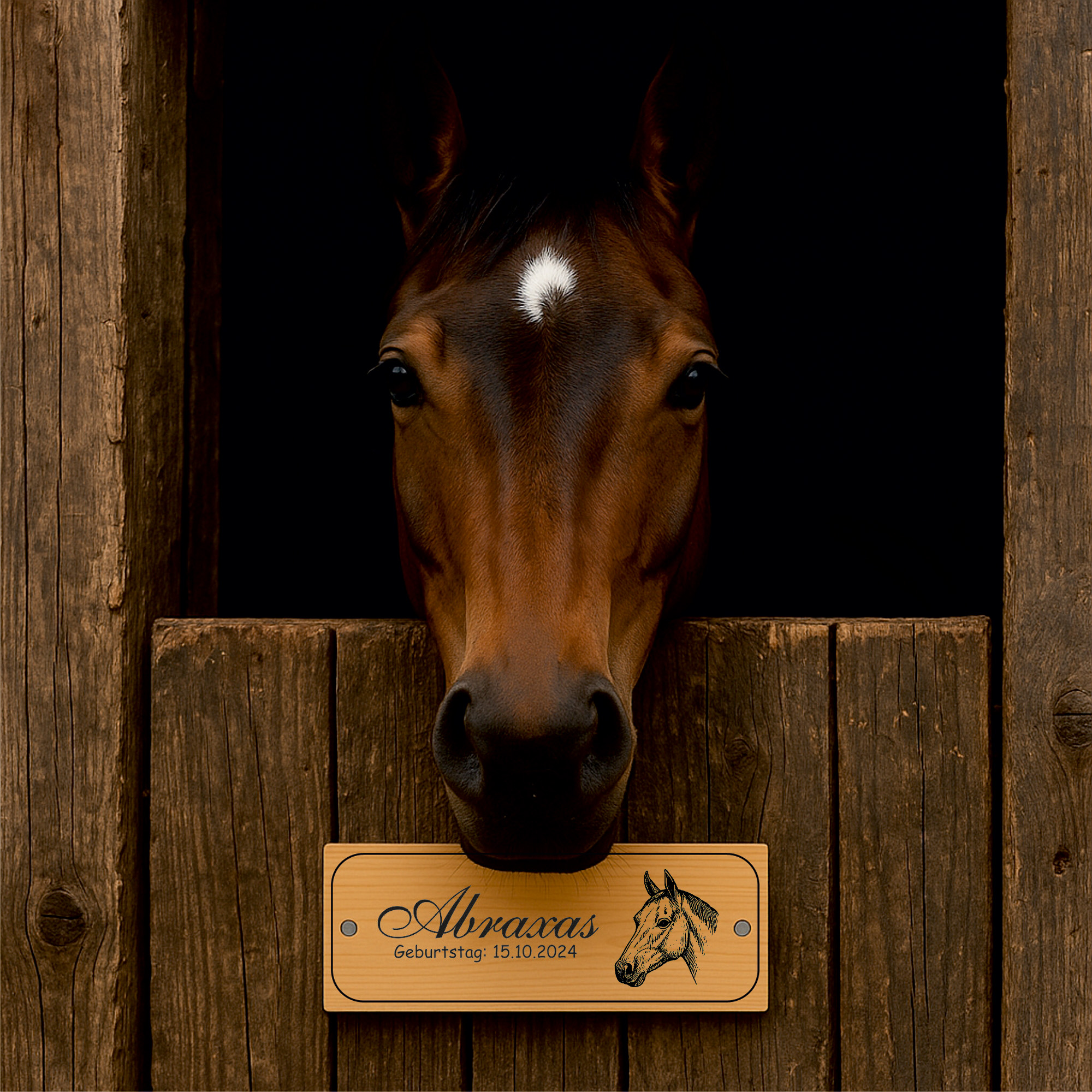 Die linke Schildhälfte bietet Platz für eine große Namenszeile sowie bis zu zwei Zusatzzeilen. So können beispielsweise Pferdename, Besitzername, Boxennummer oder Stallinformationen individuell eingraviert werden. Auf der rechten Seite befindet sich eine fein gezeichnete Pferdekopf-Illustration, die dem Schild einen edlen, persönlichen Charakter verleiht.