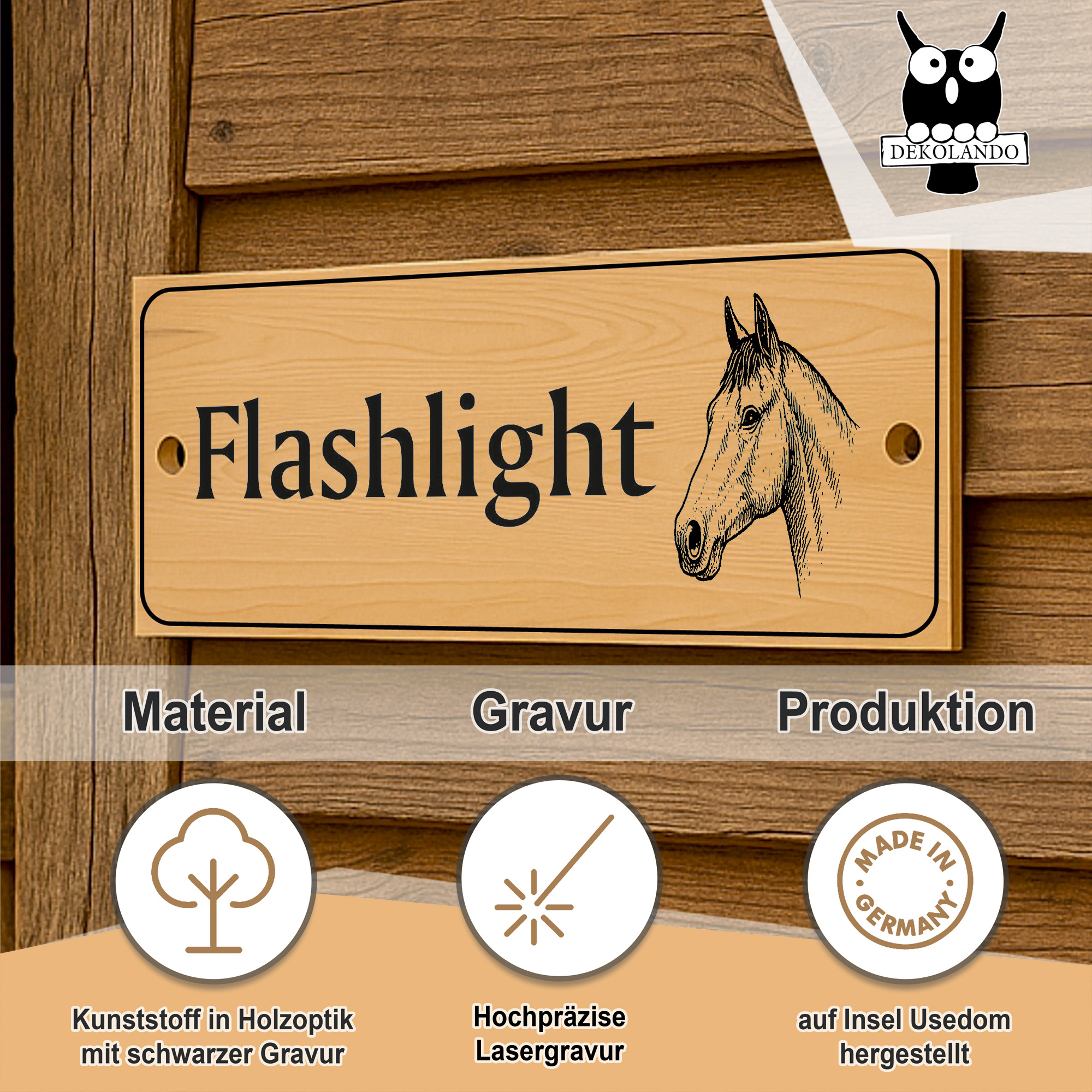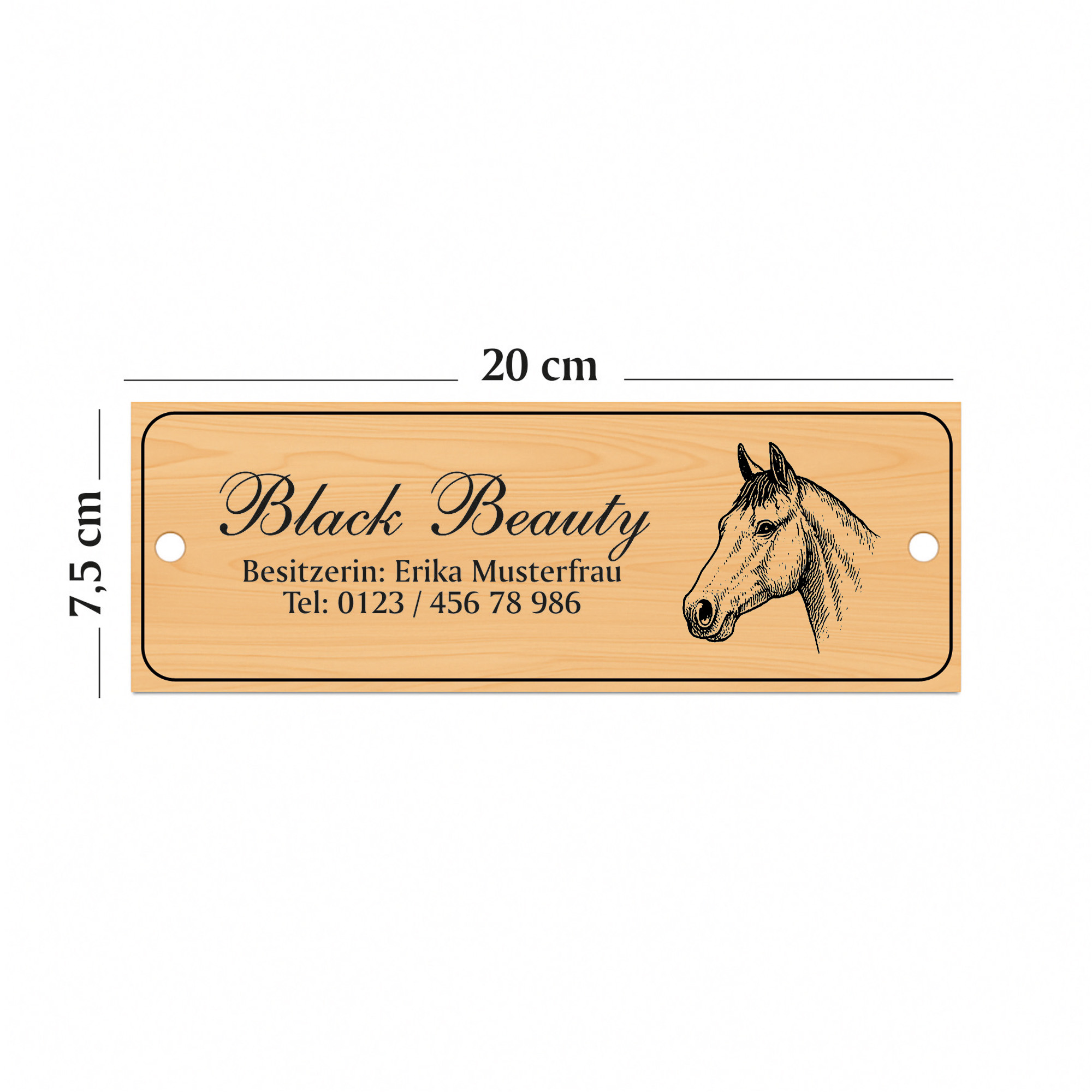 Die linke Schildhälfte bietet Platz für eine große Namenszeile sowie bis zu zwei Zusatzzeilen. So können beispielsweise Pferdename, Besitzername, Boxennummer oder Stallinformationen individuell eingraviert werden. Auf der rechten Seite befindet sich eine fein gezeichnete Pferdekopf-Illustration, die dem Schild einen edlen, persönlichen Charakter verleiht.