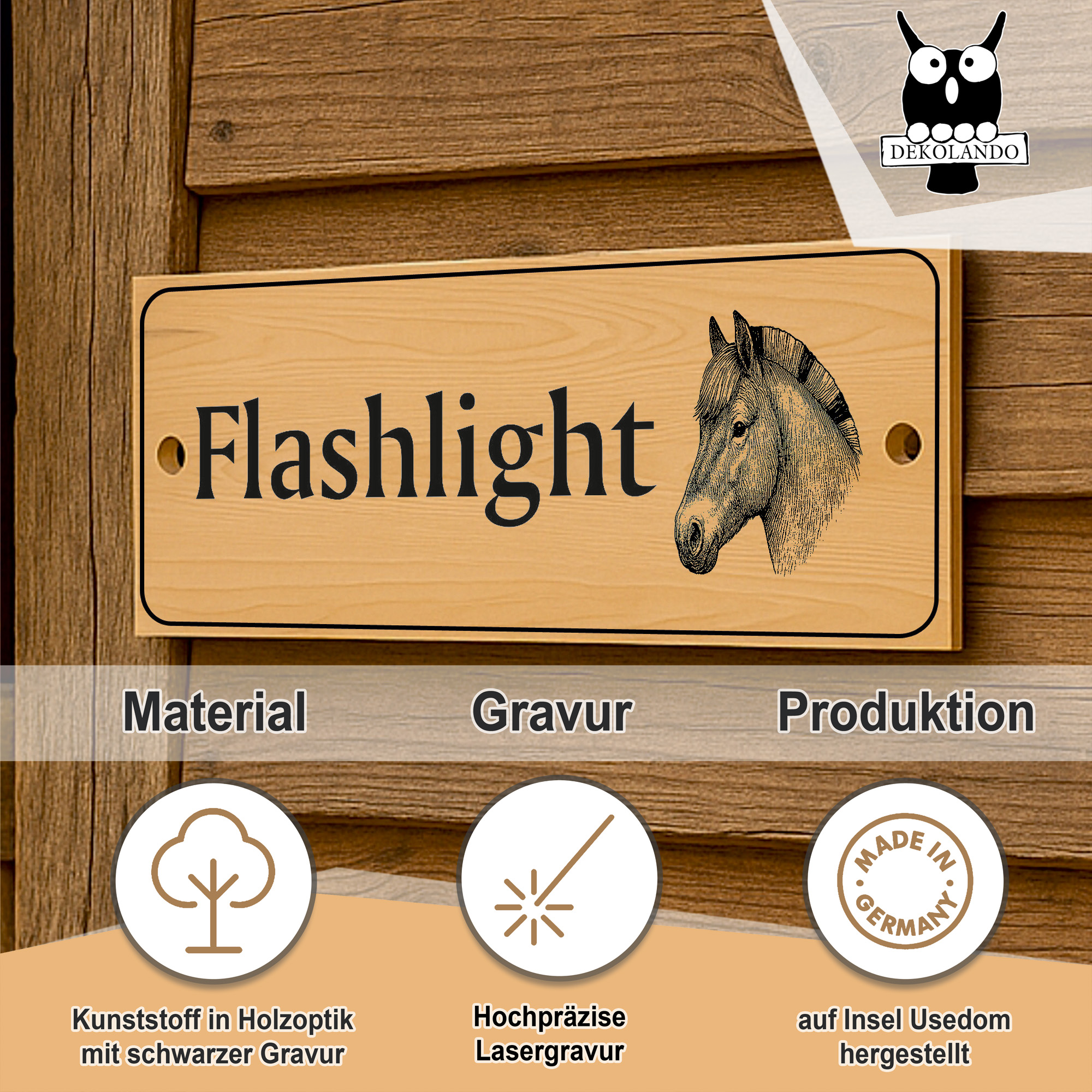 Stallschild Fjordpferd personalisierbar mit Wunschtext – Stalltafel Pferdeschild Pferdebox Holzoptik - 20×7,5 cm