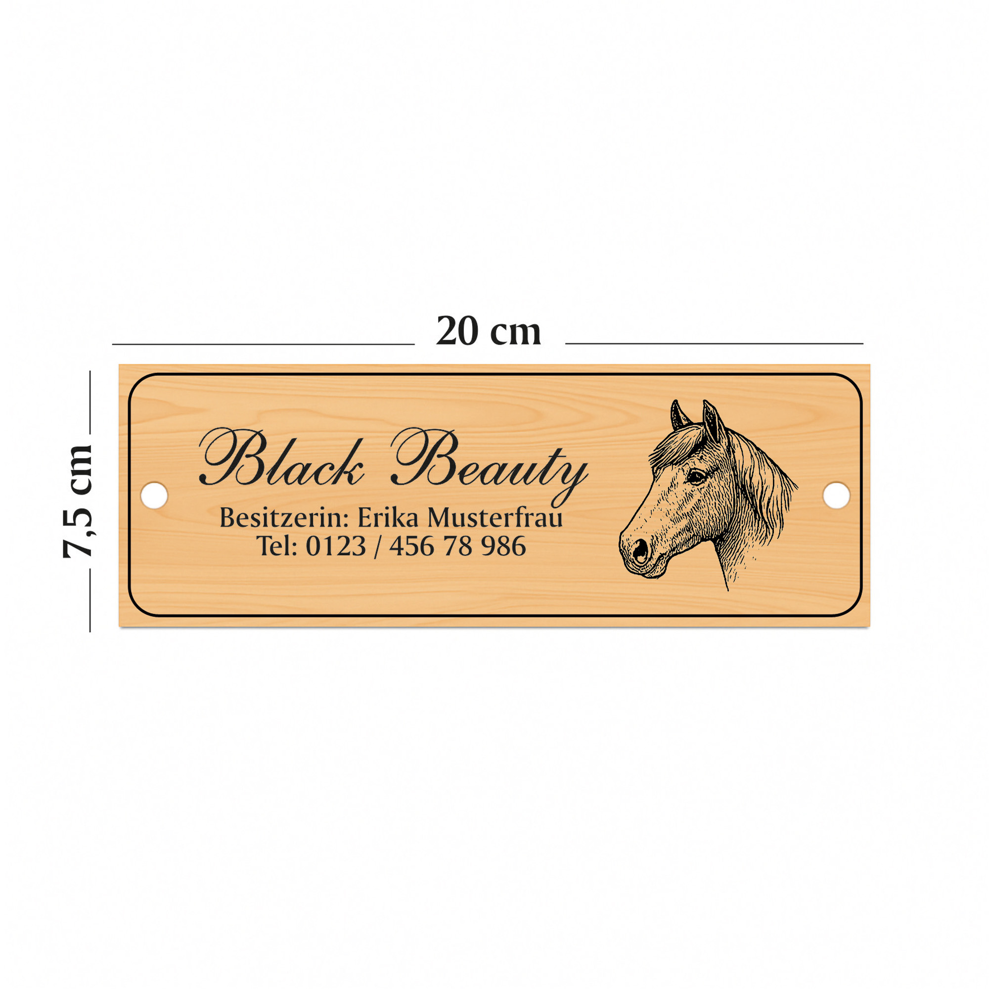 Die linke Schildhälfte bietet Platz für eine große Namenszeile sowie bis zu zwei Zusatzzeilen. So können beispielsweise Pferdename, Besitzername, Boxennummer oder Stallinformationen individuell eingraviert werden. Auf der rechten Seite befindet sich eine fein gezeichnete Pferdekopf-Illustration, die dem Schild einen edlen, persönlichen Charakter verleiht.