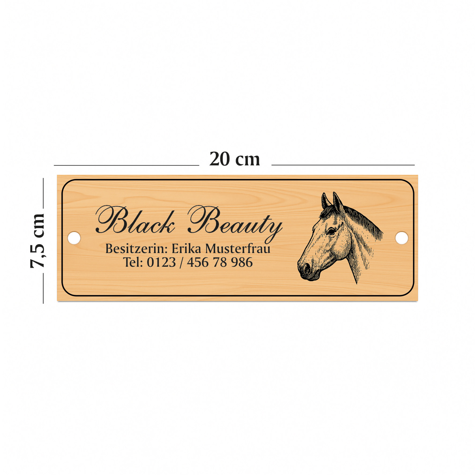 Die linke Schildhälfte bietet Platz für eine große Namenszeile sowie bis zu zwei Zusatzzeilen. So können beispielsweise Pferdename, Besitzername, Boxennummer oder Stallinformationen individuell eingraviert werden. Auf der rechten Seite befindet sich eine fein gezeichnete Pferdekopf-Illustration, die dem Schild einen edlen, persönlichen Charakter verleiht.