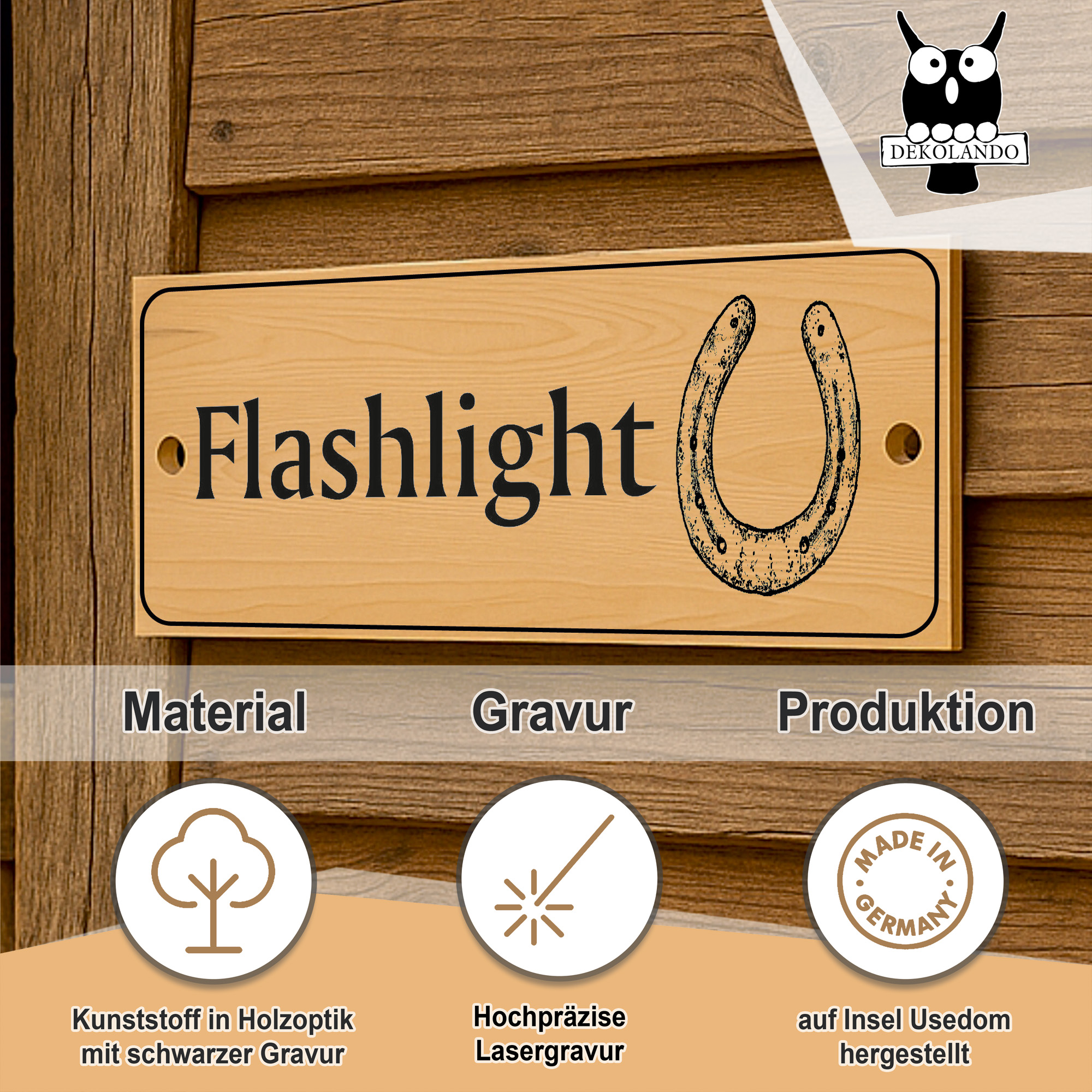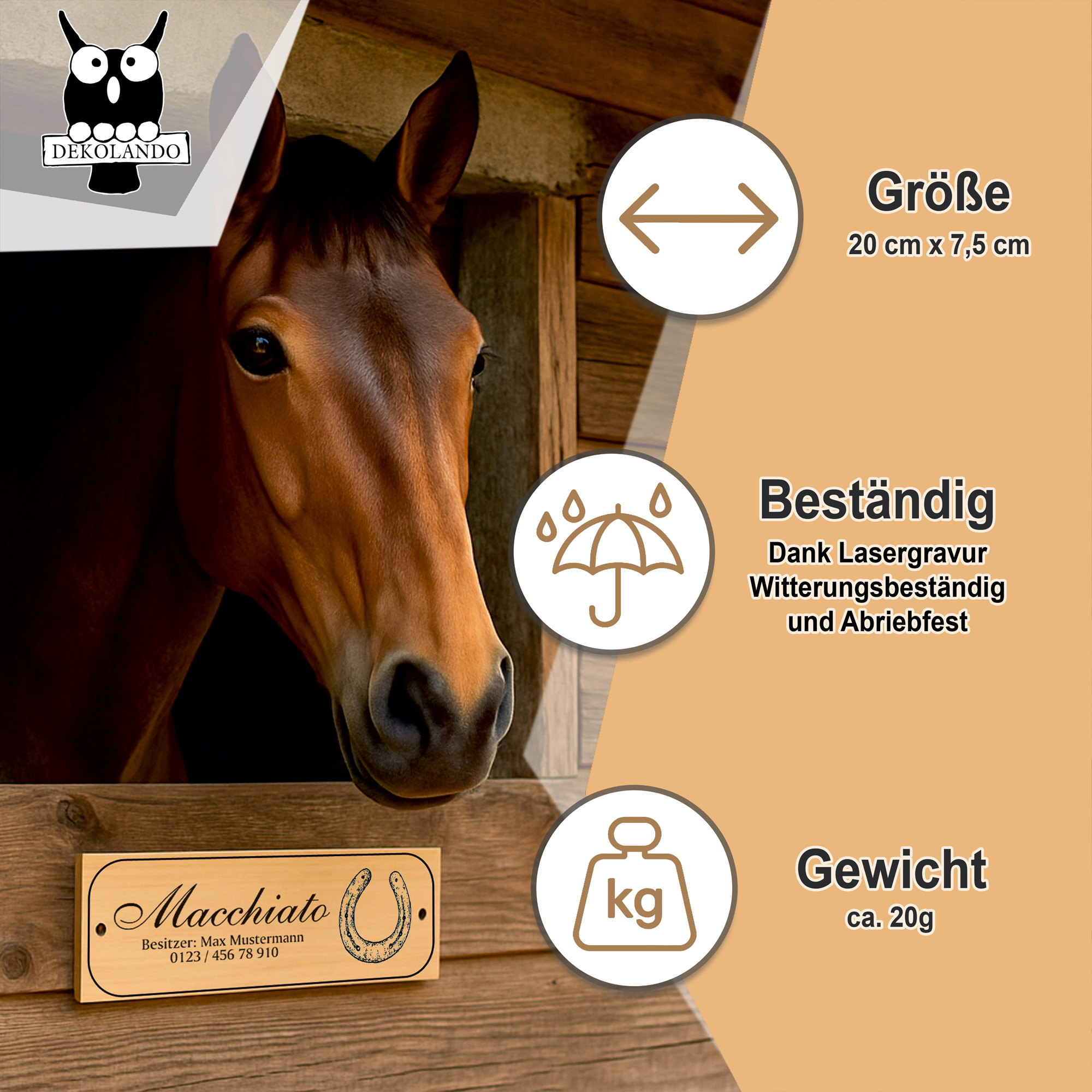 Stallschild Hufeisen personalisierbar mit Wunschtext – Stalltafel Pferdeschild Pferdebox Holzoptik - 20×7,5 cm