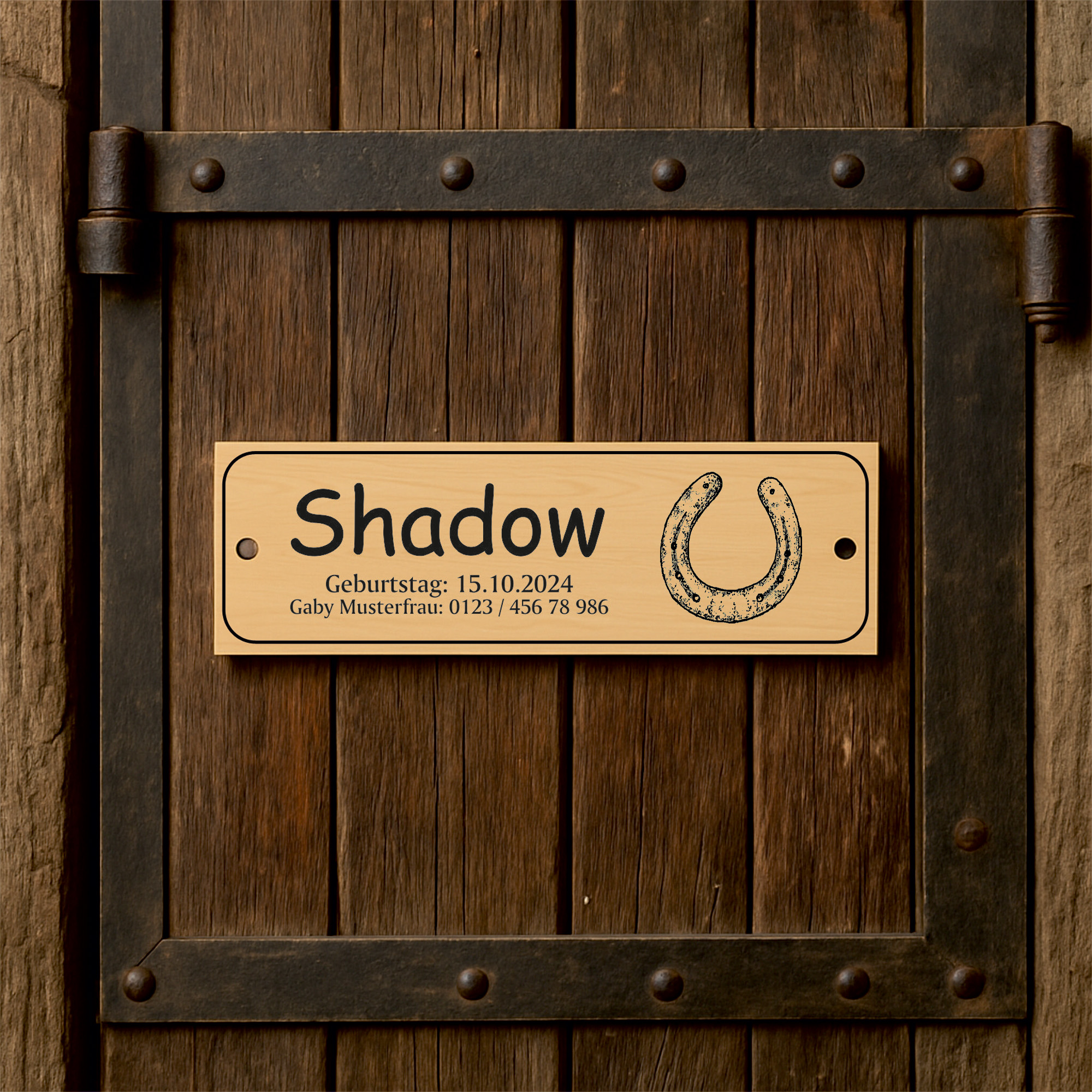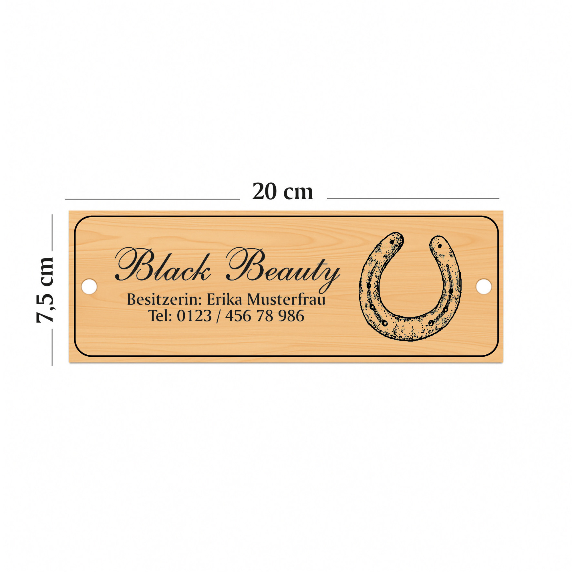 Die linke Schildhälfte bietet Platz für eine große Namenszeile sowie bis zu zwei Zusatzzeilen. So können beispielsweise Pferdename, Besitzername, Boxennummer oder Stallinformationen individuell eingraviert werden. Auf der rechten Seite befindet sich eine fein gezeichnete Pferdekopf-Illustration, die dem Schild einen edlen, persönlichen Charakter verleiht.