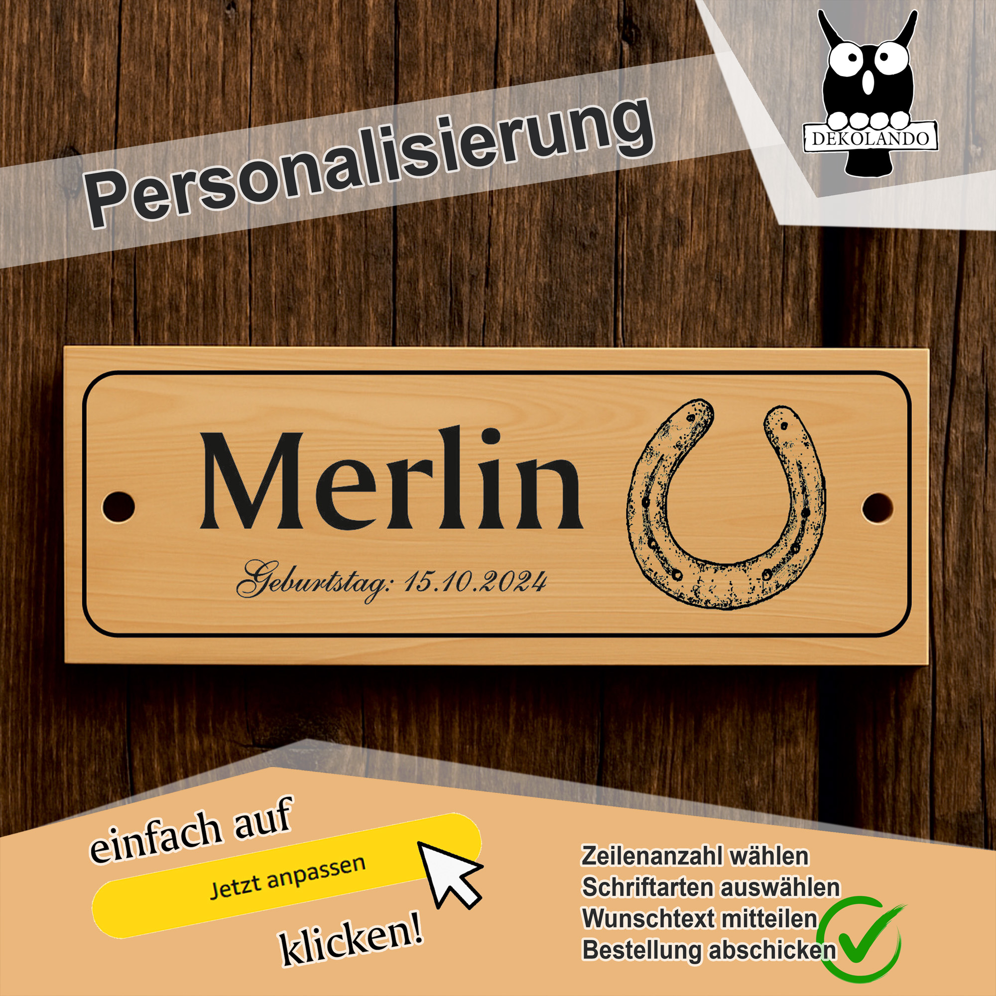 - Personalisiertes Stallschild mit Pferdekopf – Hochwertiges Schild im Querformat (20×7,5 cm) mit individueller Beschriftung in bis zu 3 Zeilen. Ideal als Namensschild für Pferdebox, Stall oder Paddock.