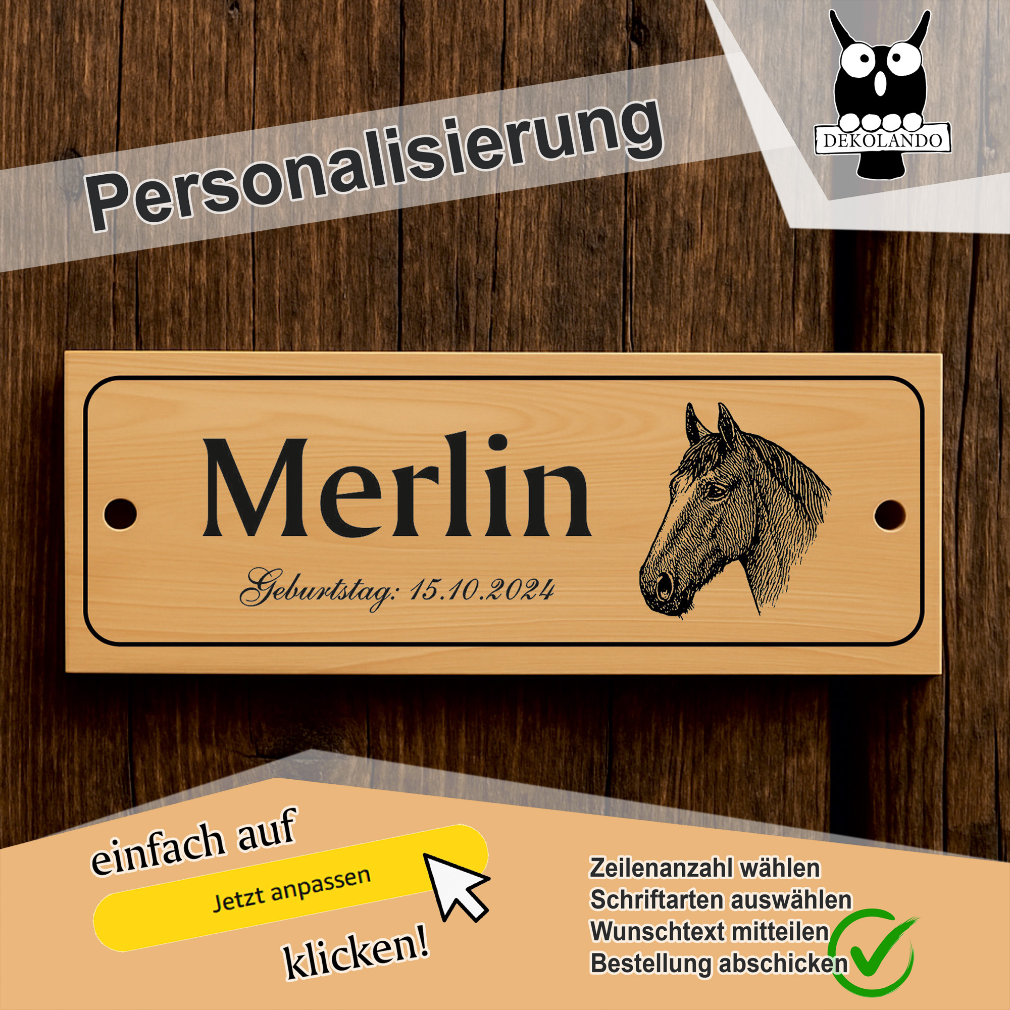 - Personalisiertes Stallschild mit Pferdekopf – Hochwertiges Schild im Querformat (20×7,5 cm) mit individueller Beschriftung in bis zu 3 Zeilen. Ideal als Namensschild für Pferdebox, Stall oder Paddock.