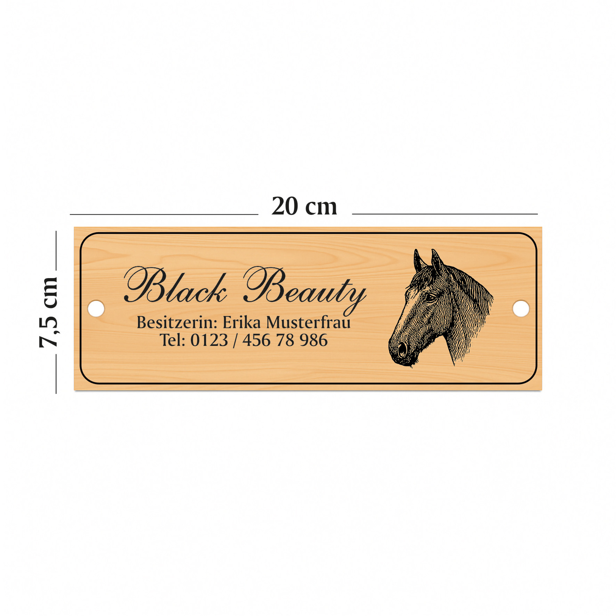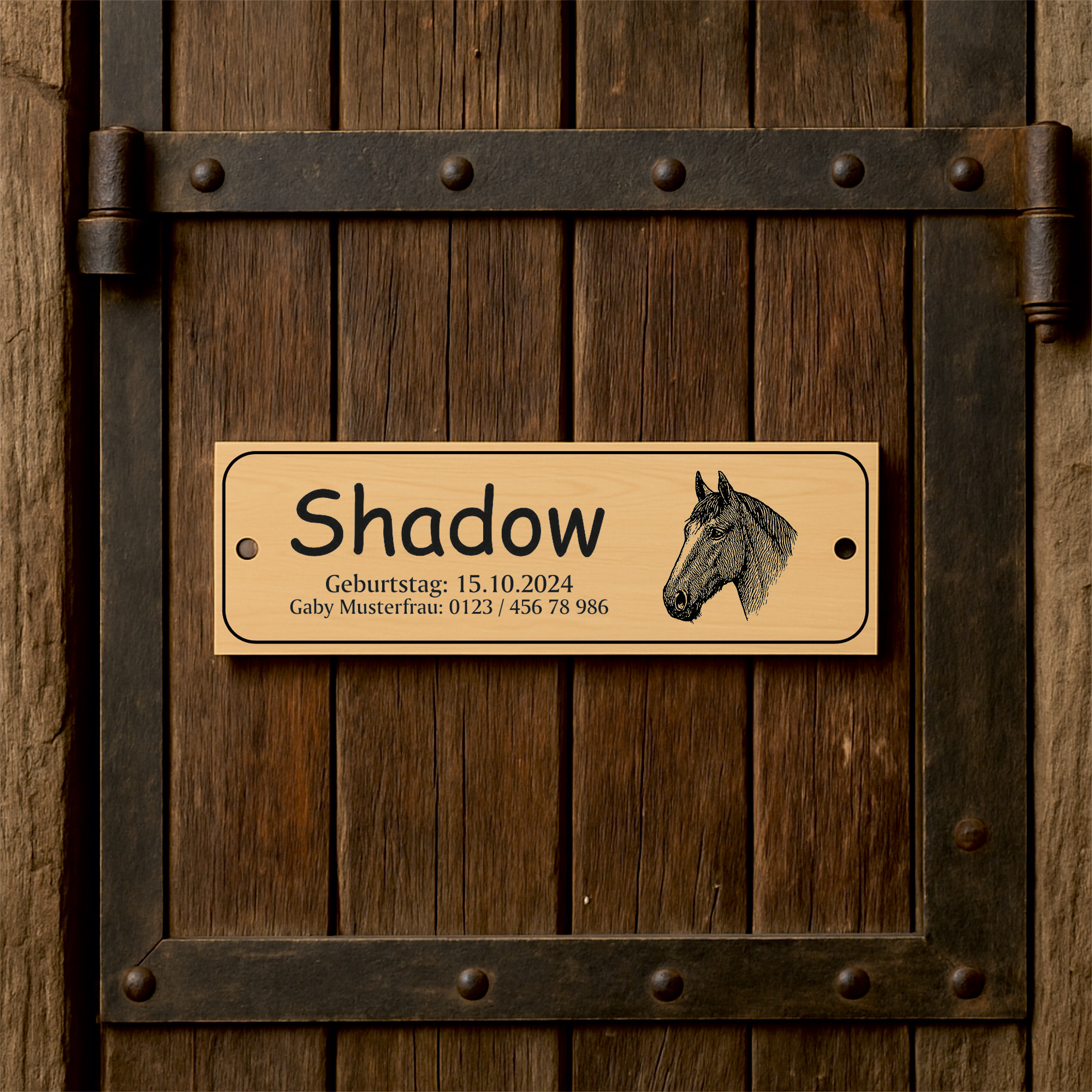 Die linke Schildhälfte bietet Platz für eine große Namenszeile sowie bis zu zwei Zusatzzeilen. So können beispielsweise Pferdename, Besitzername, Boxennummer oder Stallinformationen individuell eingraviert werden. Auf der rechten Seite befindet sich eine fein gezeichnete Pferdekopf-Illustration, die dem Schild einen edlen, persönlichen Charakter verleiht.