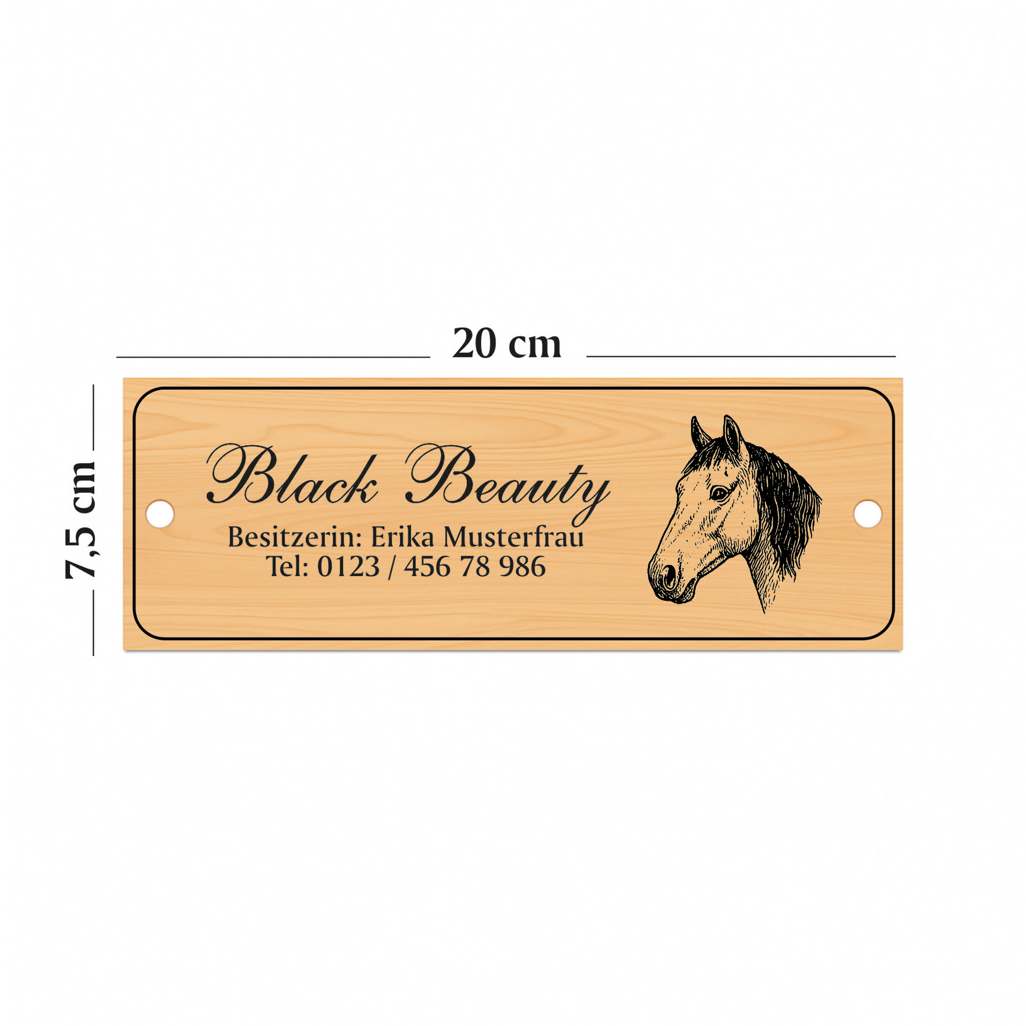 Die linke Schildhälfte bietet Platz für eine große Namenszeile sowie bis zu zwei Zusatzzeilen. So können beispielsweise Pferdename, Besitzername, Boxennummer oder Stallinformationen individuell eingraviert werden. Auf der rechten Seite befindet sich eine fein gezeichnete Pferdekopf-Illustration, die dem Schild einen edlen, persönlichen Charakter verleiht.