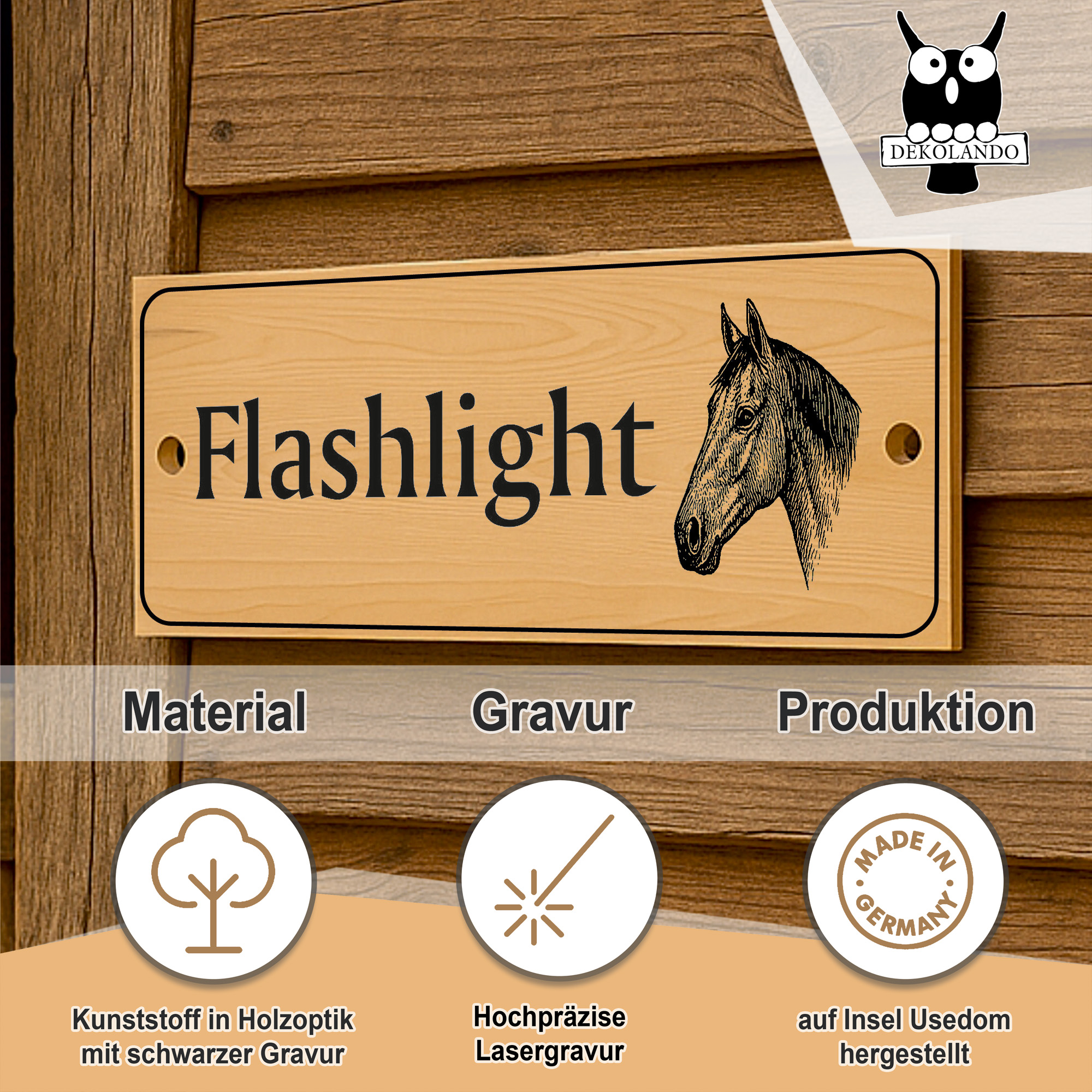 Die linke Schildhälfte bietet Platz für eine große Namenszeile sowie bis zu zwei Zusatzzeilen. So können beispielsweise Pferdename, Besitzername, Boxennummer oder Stallinformationen individuell eingraviert werden. Auf der rechten Seite befindet sich eine fein gezeichnete Pferdekopf-Illustration, die dem Schild einen edlen, persönlichen Charakter verleiht.