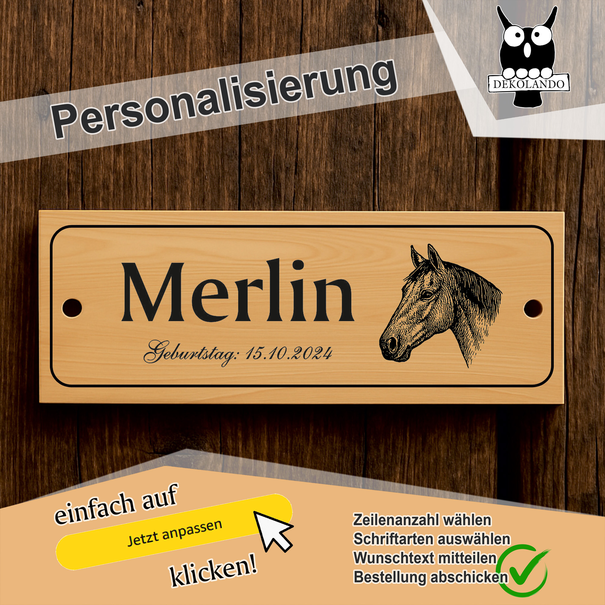 - Personalisiertes Stallschild mit Pferdekopf – Hochwertiges Schild im Querformat (20×7,5 cm) mit individueller Beschriftung in bis zu 3 Zeilen. Ideal als Namensschild für Pferdebox, Stall oder Paddock.