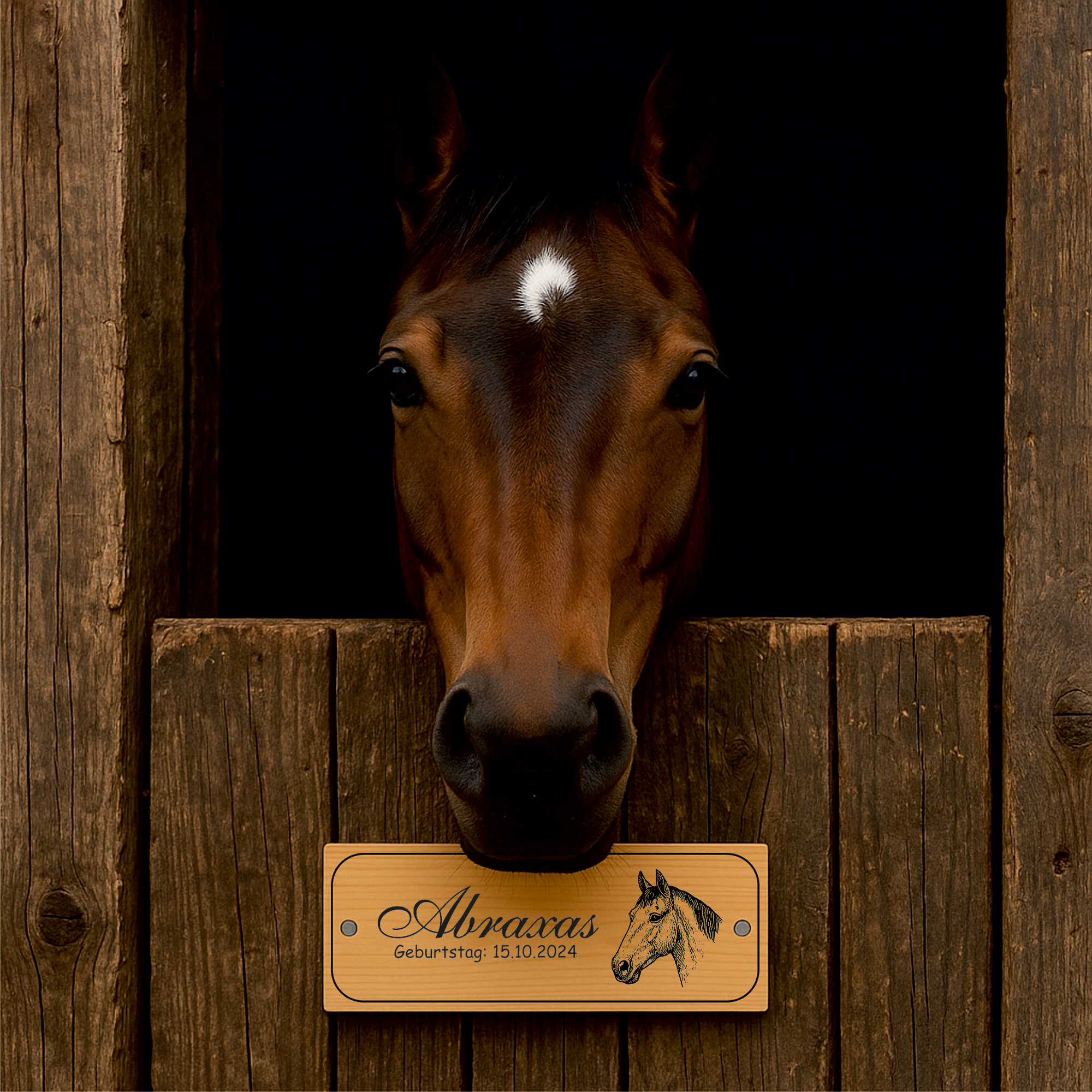 Die linke Schildhälfte bietet Platz für eine große Namenszeile sowie bis zu zwei Zusatzzeilen. So können beispielsweise Pferdename, Besitzername, Boxennummer oder Stallinformationen individuell eingraviert werden. Auf der rechten Seite befindet sich eine fein gezeichnete Pferdekopf-Illustration, die dem Schild einen edlen, persönlichen Charakter verleiht.