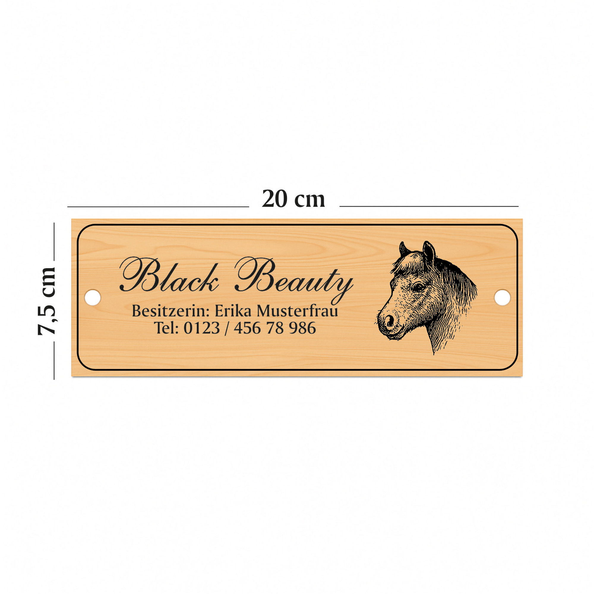 Die linke Schildhälfte bietet Platz für eine große Namenszeile sowie bis zu zwei Zusatzzeilen. So können beispielsweise Pferdename, Besitzername, Boxennummer oder Stallinformationen individuell eingraviert werden. Auf der rechten Seite befindet sich eine fein gezeichnete Pferdekopf-Illustration, die dem Schild einen edlen, persönlichen Charakter verleiht.