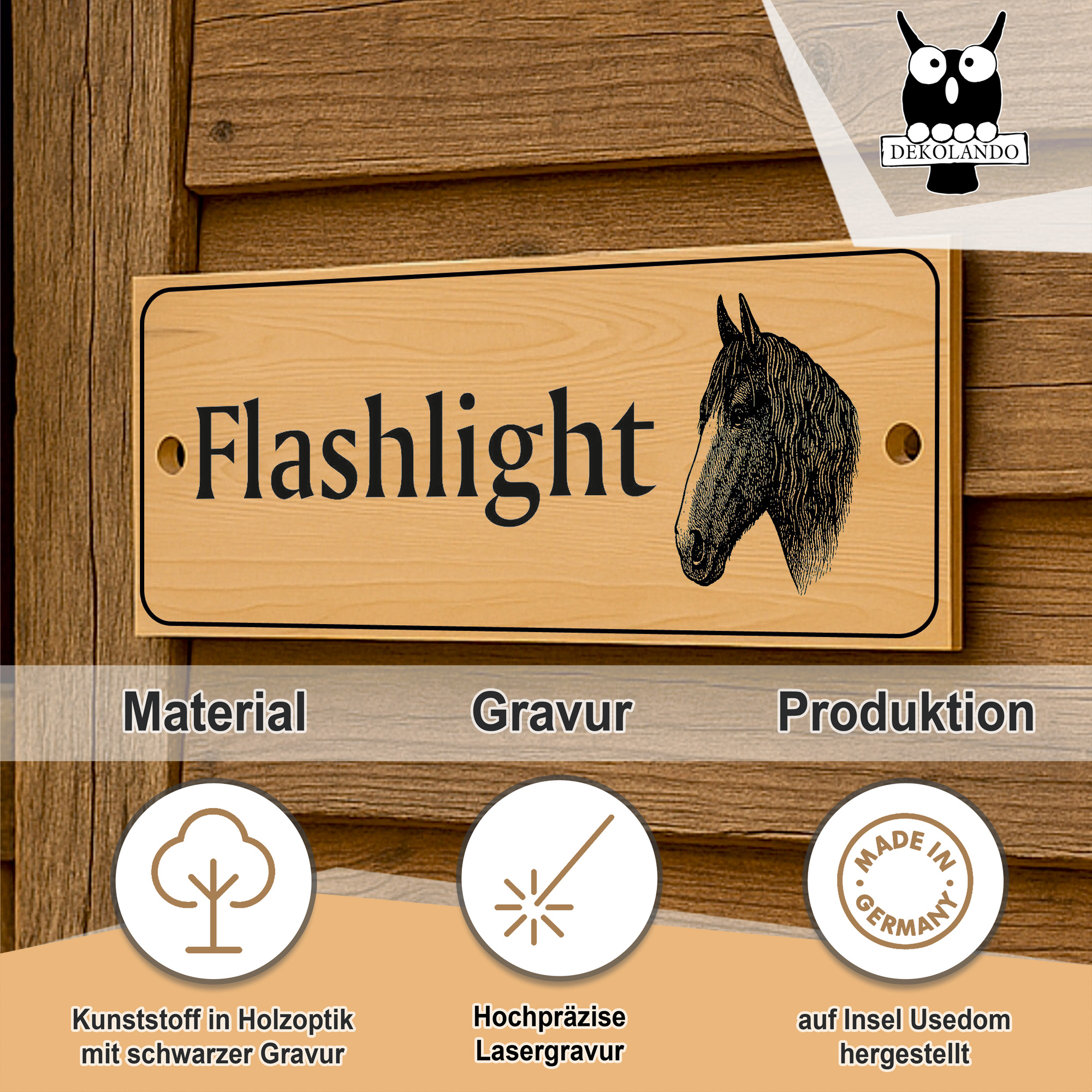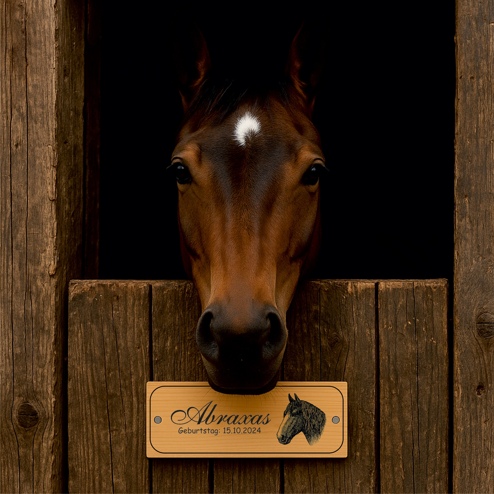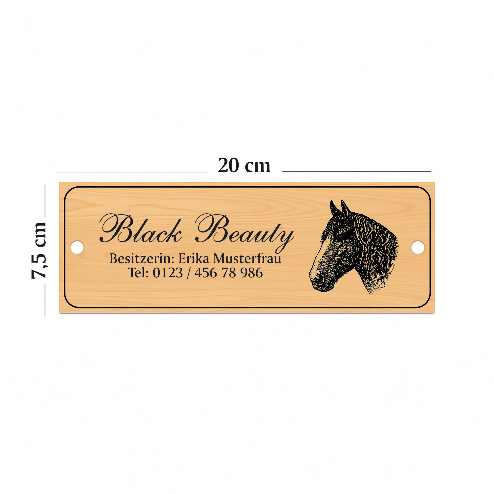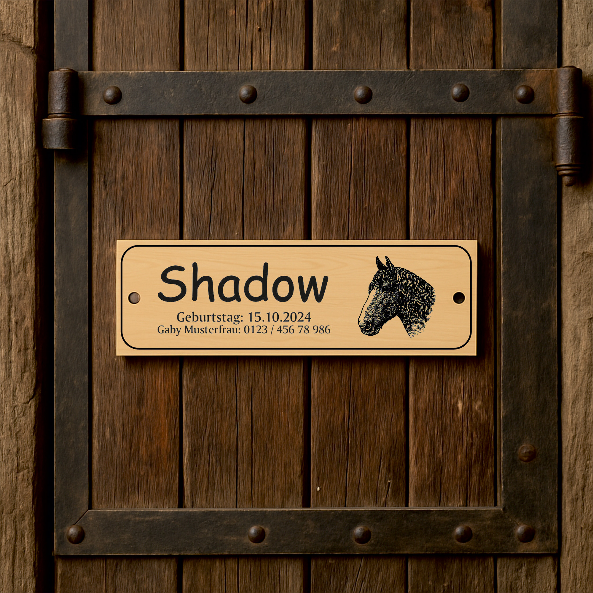 Die linke Schildhälfte bietet Platz für eine große Namenszeile sowie bis zu zwei Zusatzzeilen. So können beispielsweise Pferdename, Besitzername, Boxennummer oder Stallinformationen individuell eingraviert werden. Auf der rechten Seite befindet sich eine fein gezeichnete Pferdekopf-Illustration, die dem Schild einen edlen, persönlichen Charakter verleiht.
