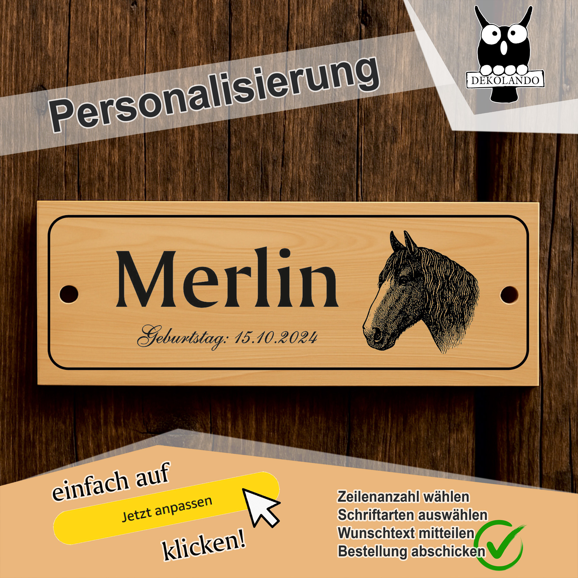 - Personalisiertes Stallschild mit Pferdekopf – Hochwertiges Schild im Querformat (20×7,5 cm) mit individueller Beschriftung in bis zu 3 Zeilen. Ideal als Namensschild für Pferdebox, Stall oder Paddock.