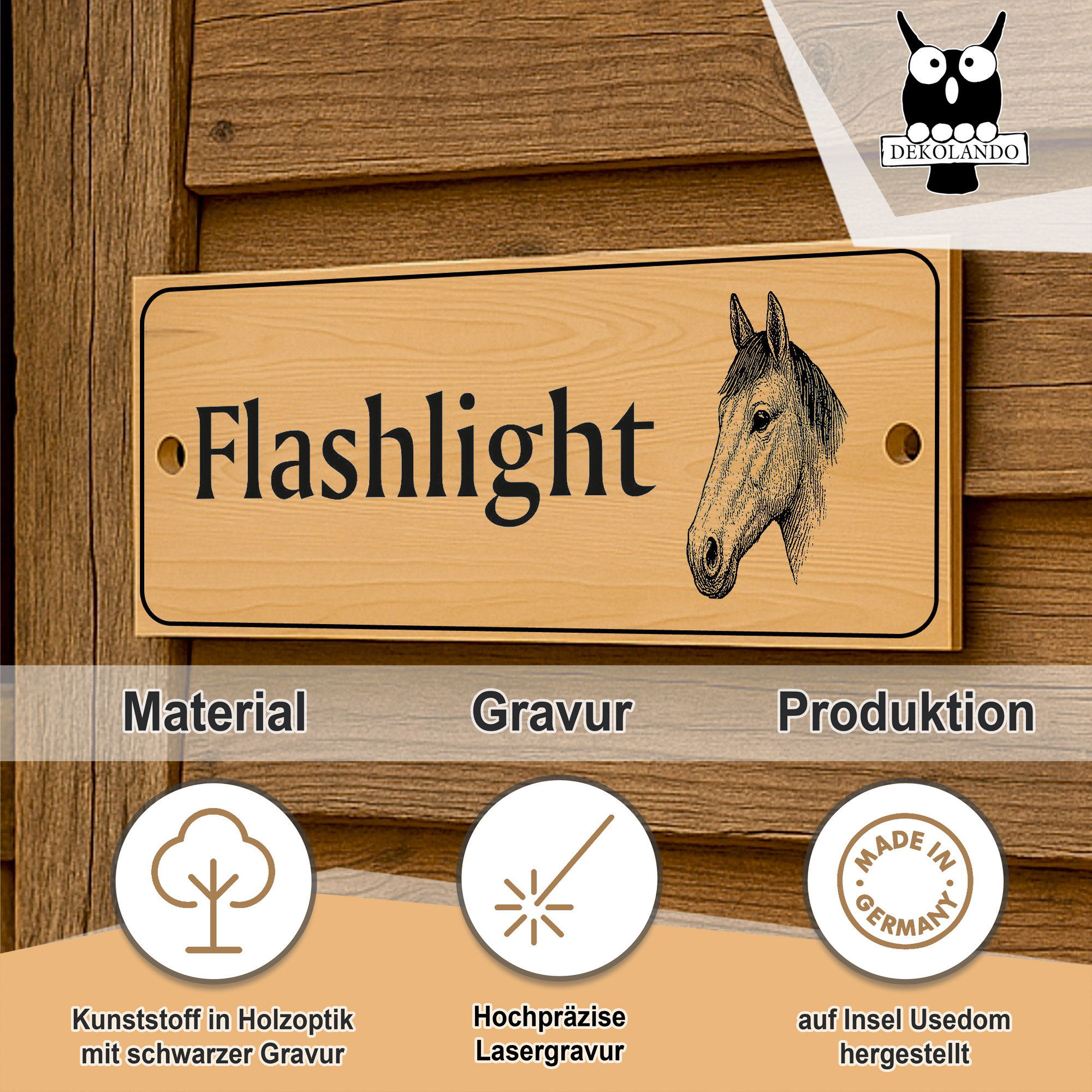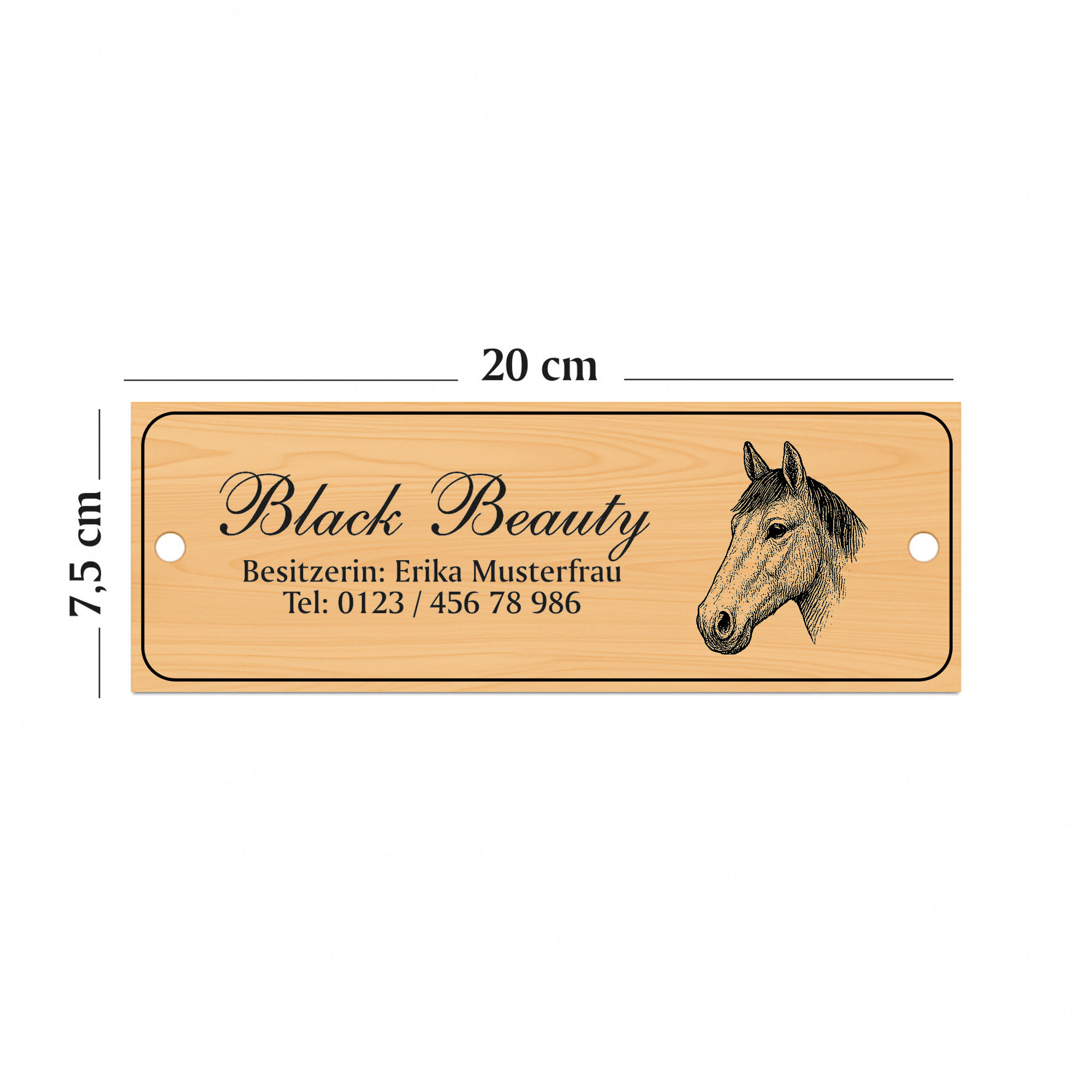 Die linke Schildhälfte bietet Platz für eine große Namenszeile sowie bis zu zwei Zusatzzeilen. So können beispielsweise Pferdename, Besitzername, Boxennummer oder Stallinformationen individuell eingraviert werden. Auf der rechten Seite befindet sich eine fein gezeichnete Pferdekopf-Illustration, die dem Schild einen edlen, persönlichen Charakter verleiht.