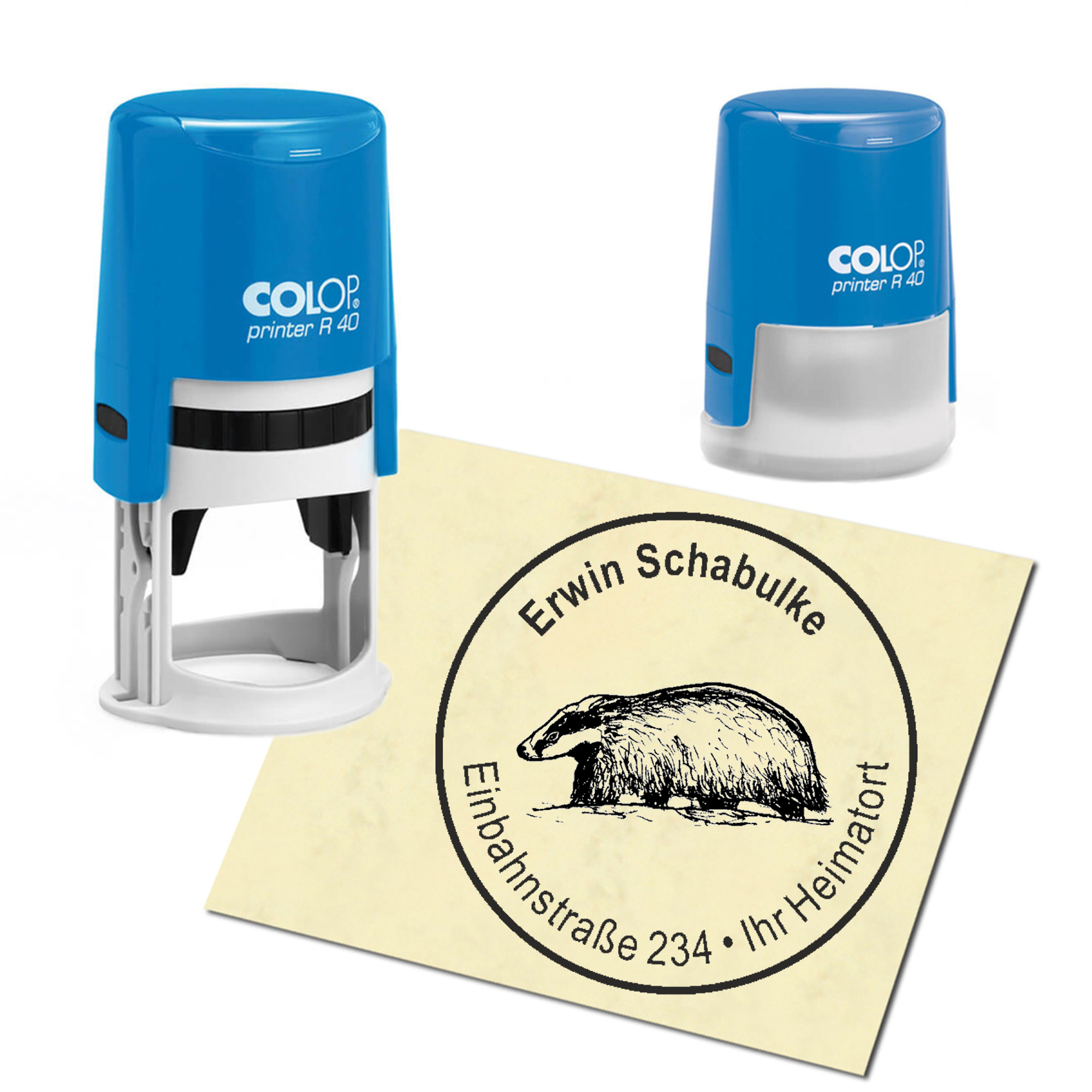 Stempel Adressstempel personalisiert - Dachs auf Sand - rund ∅ 40mm