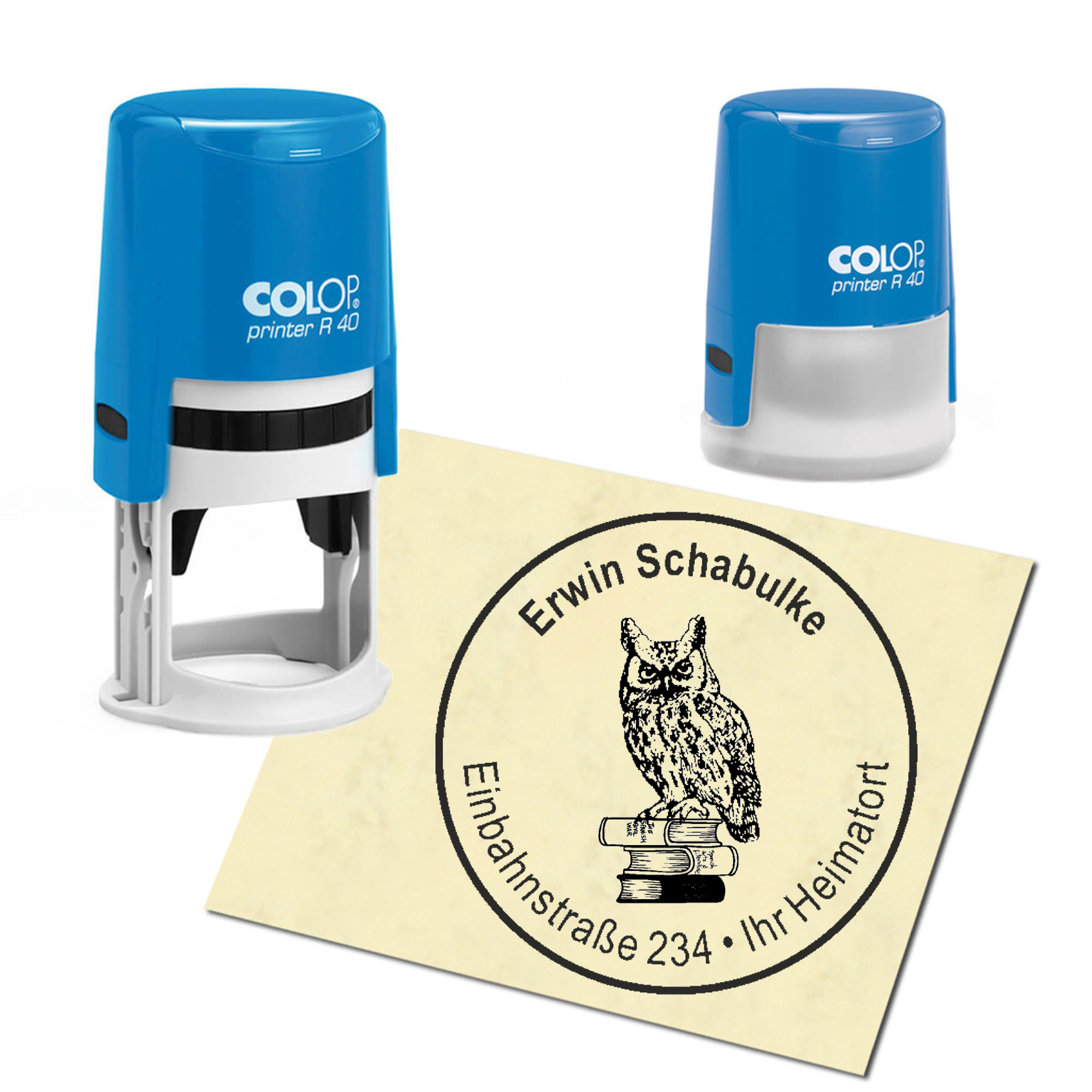 Stempel Adressstempel personalisiert - Eule auf Buch - rund ∅ 40mm
