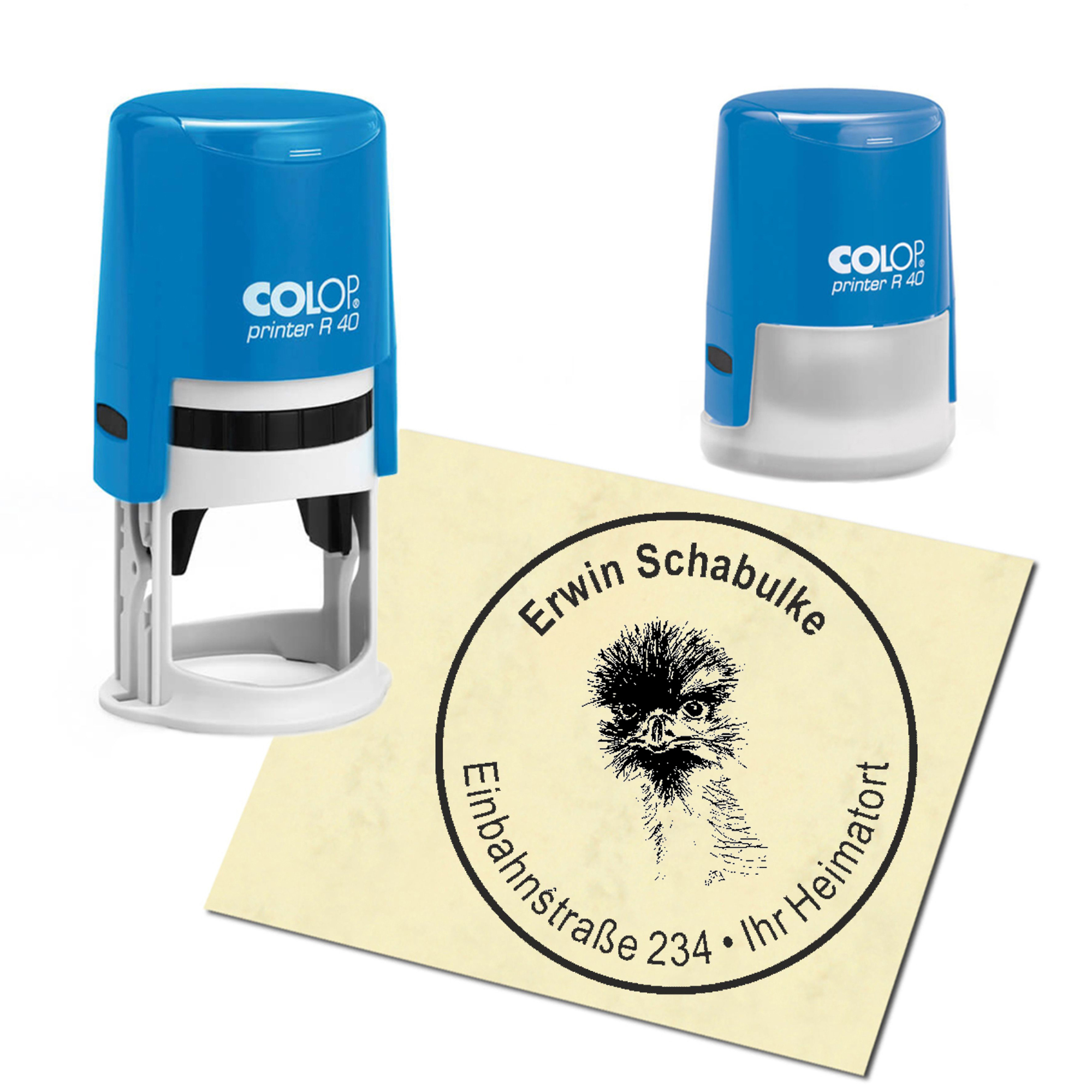 Produktinformationen "Stempel Adressstempel personalisiert - Großer Emu - rund ∅ 40mm"