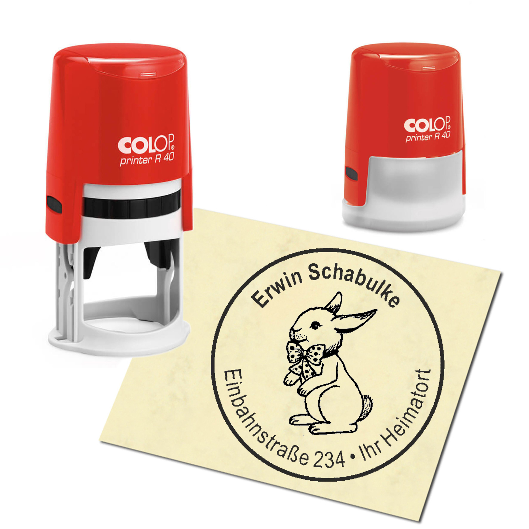 Stempel Adressstempel personalisiert - Häschen mit Schleife - rund ∅ 40mm