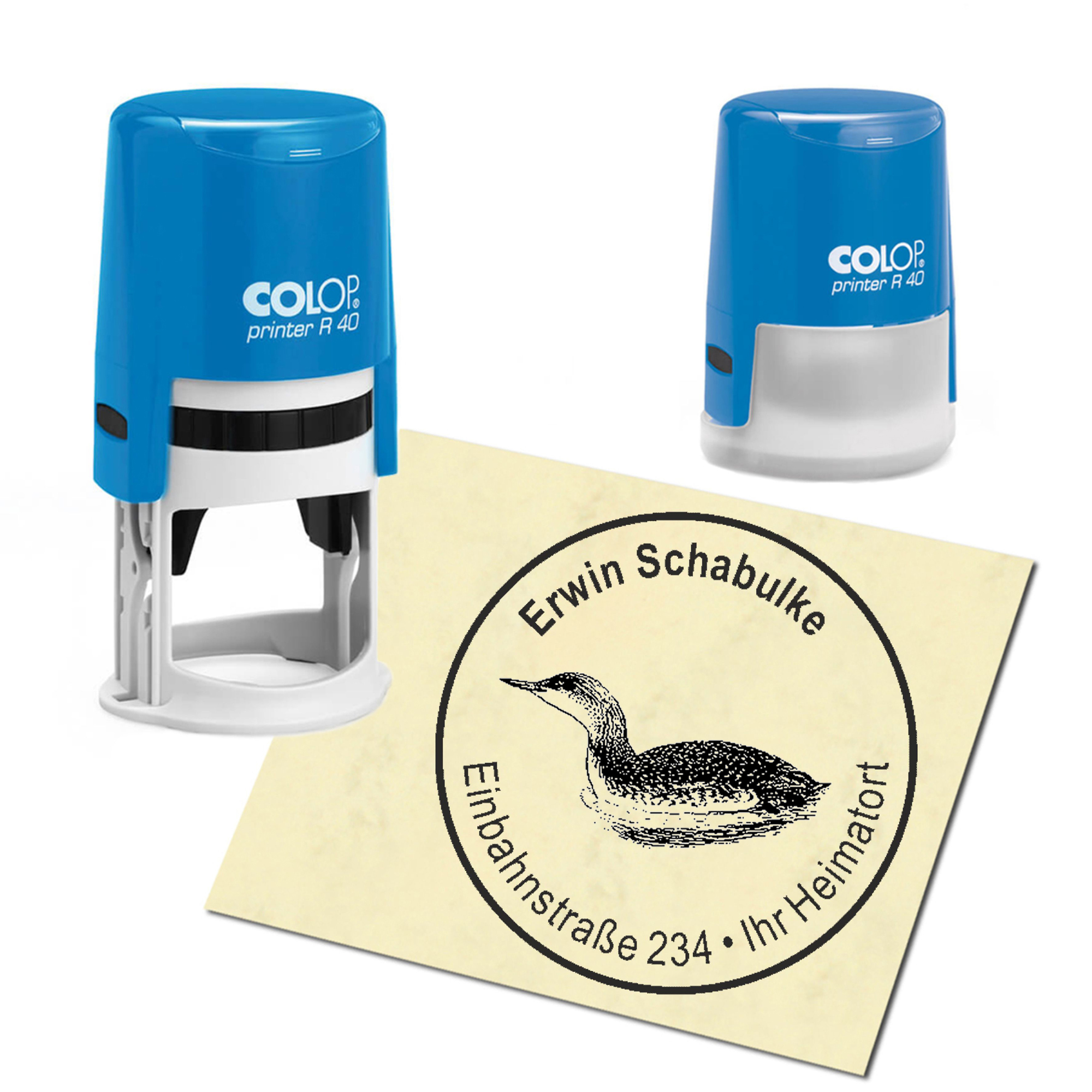 Produktinformationen "Stempel Adressstempel personalisiert - Haubentaucher - rund ∅ 40mm"