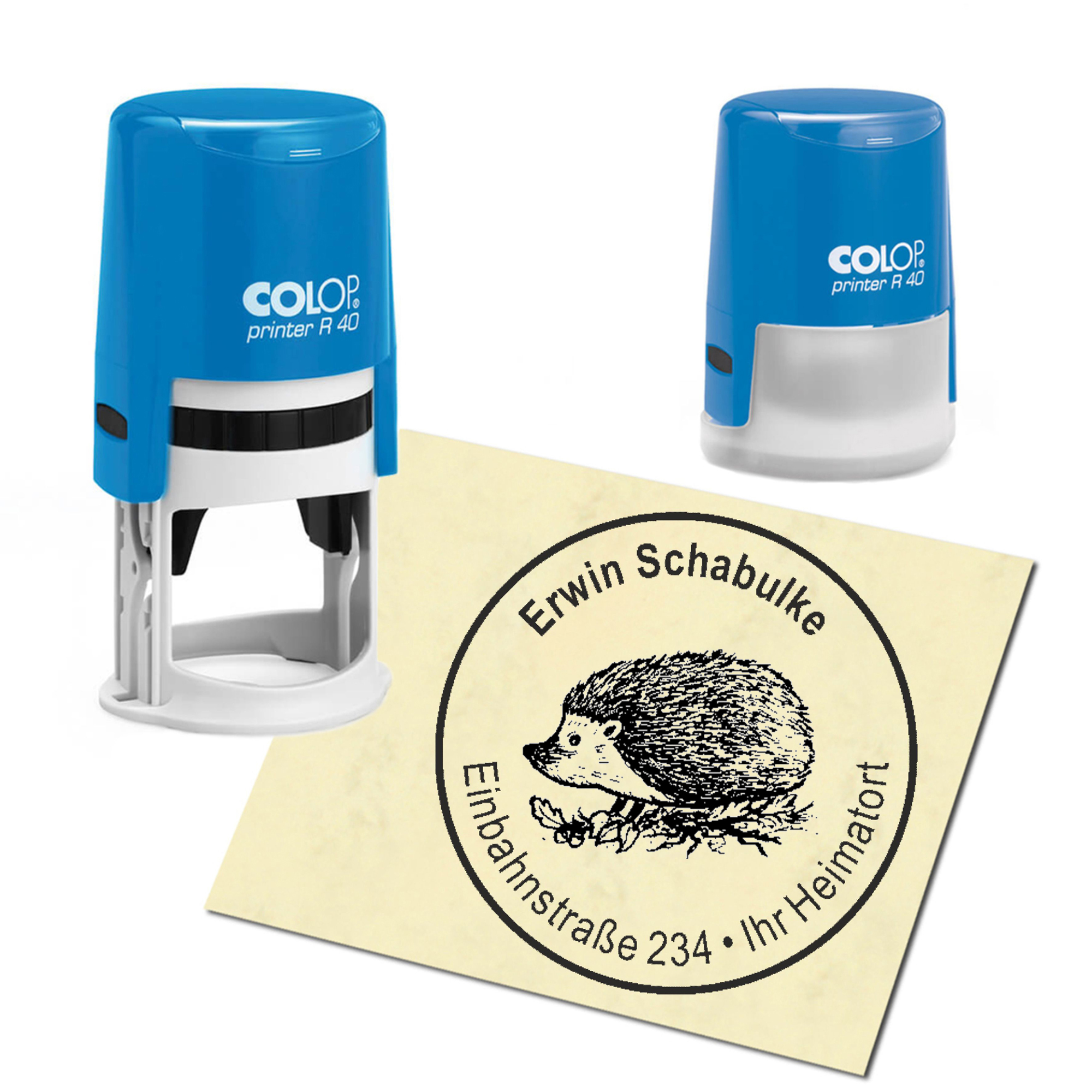 Produktinformationen "Stempel Adressstempel personalisiert - Igel auf Wiese - rund ∅ 40mm"