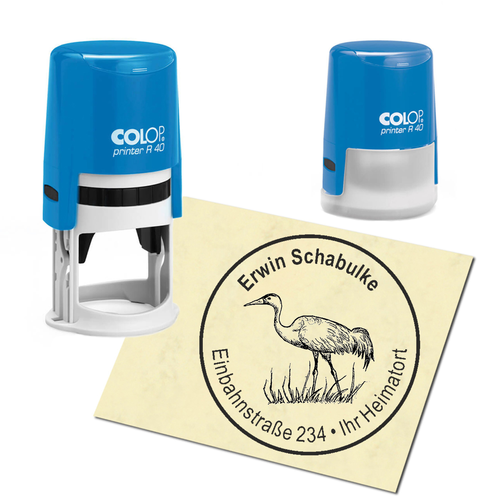 Stempel Adressstempel personalisiert - Kranich auf Wiese - rund ∅ 40mm