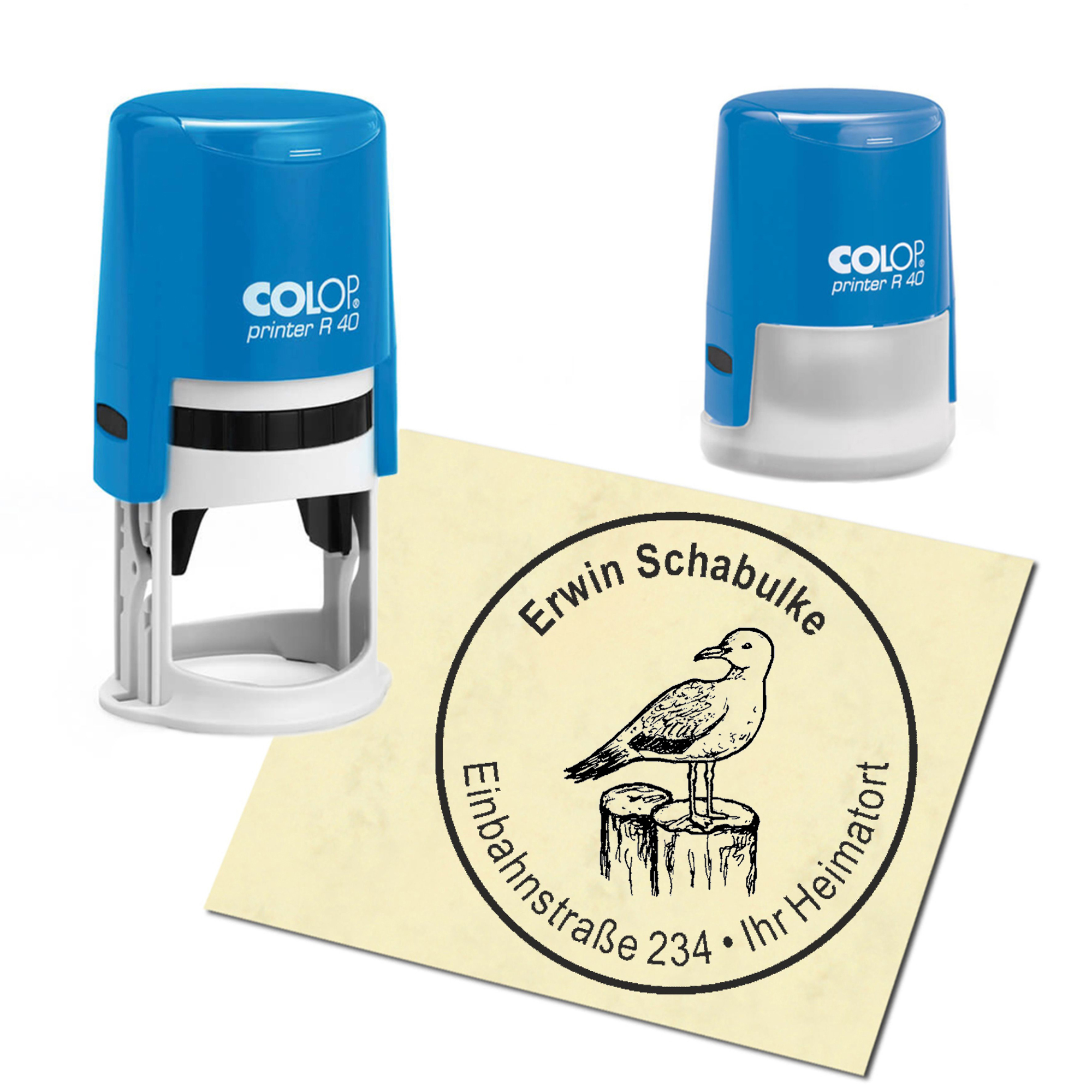 Stempel Adressstempel personalisiert - Möwe auf einer Buhne - rund ∅ 40mm