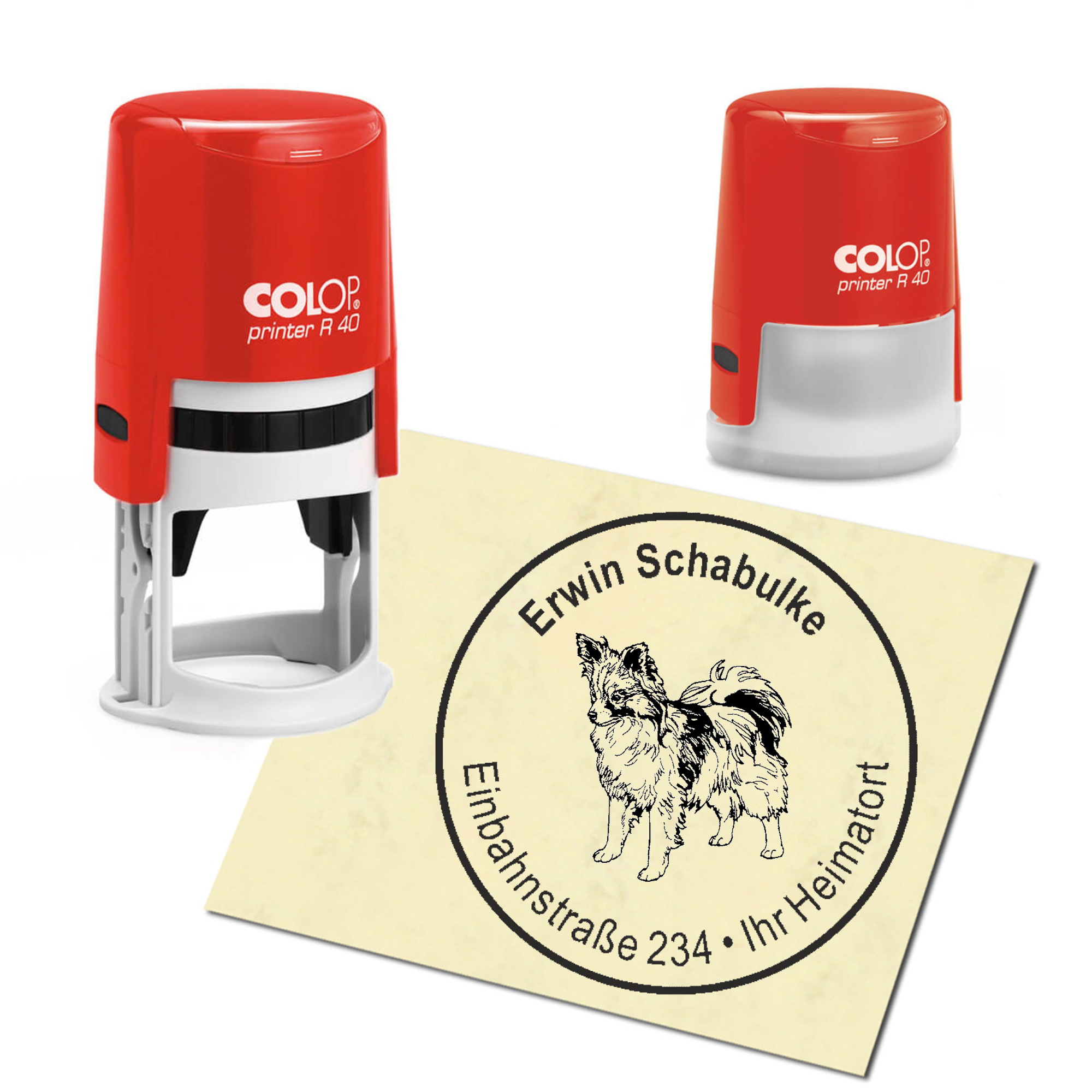 Produktinformationen "Stempel Adressstempel personalisiert - Papillon Kontinentaler Zwergspaniel - rund ∅ 40mm"