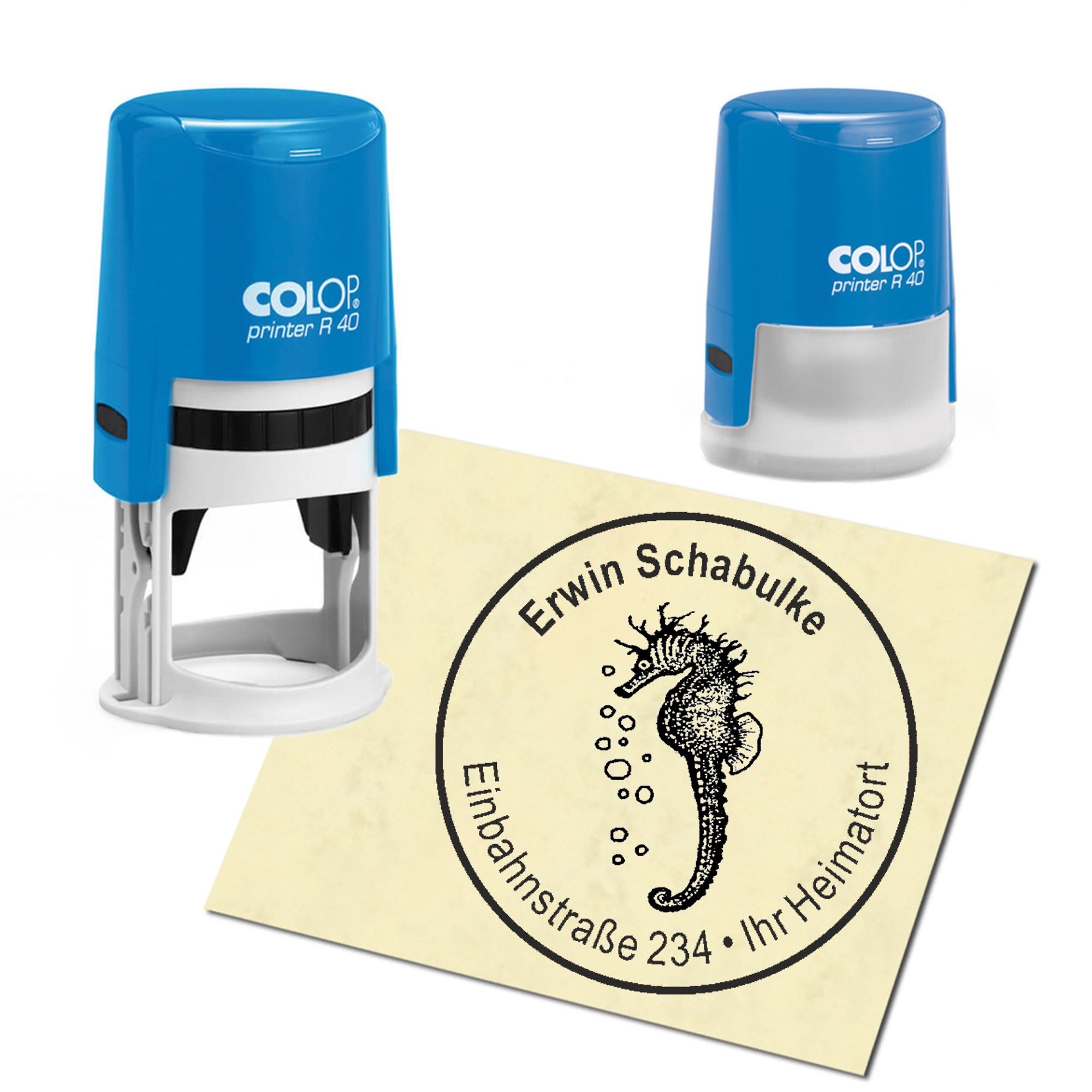 Produktinformationen "Stempel Adressstempel personalisiert - Seepferdchen mit Luftblasen - rund ∅ 40mm"