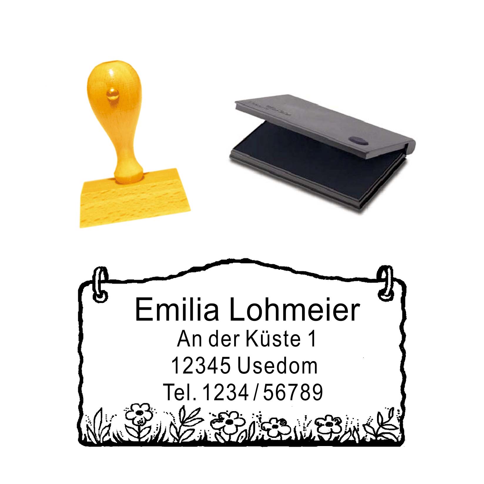 Stempel Etikett Blumenwiese - mit persönlicher Adresse und Stempelkissen