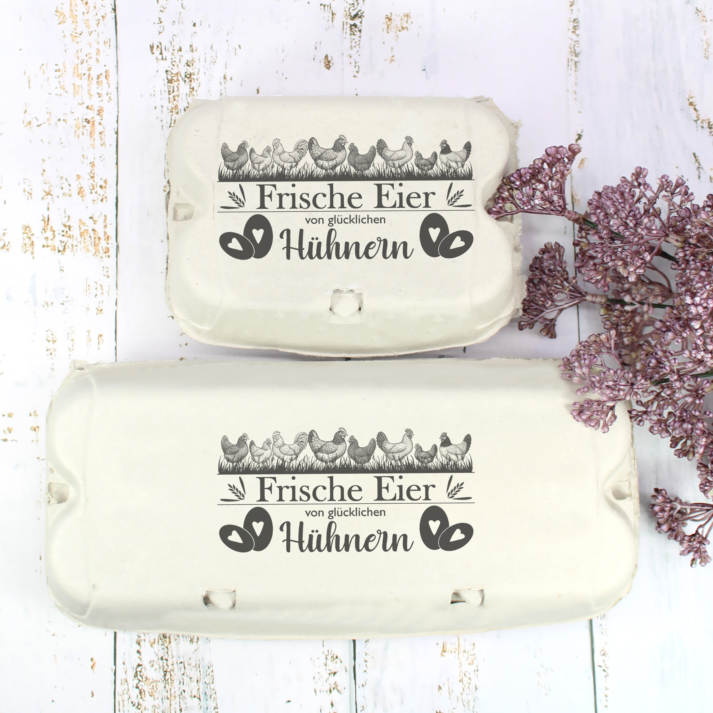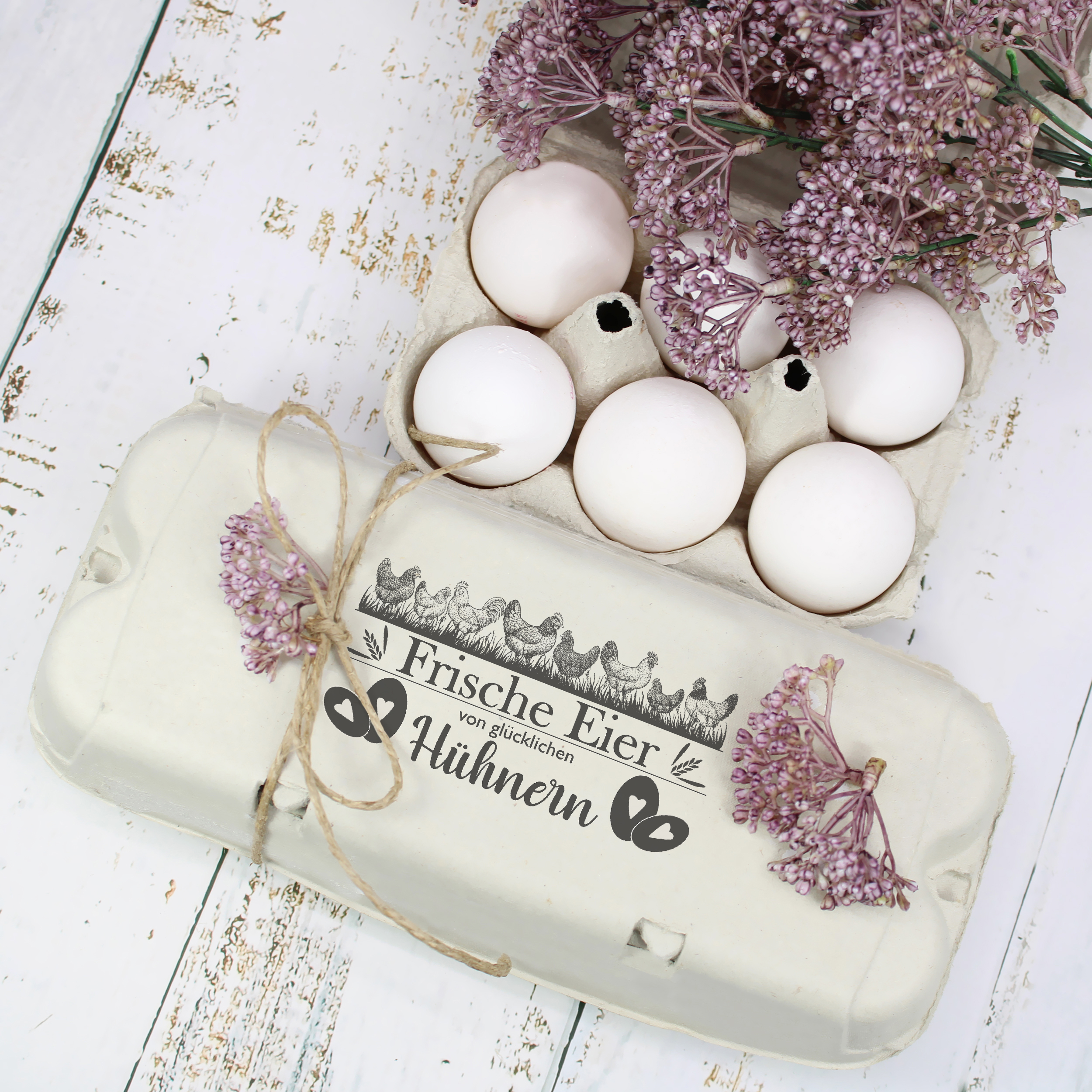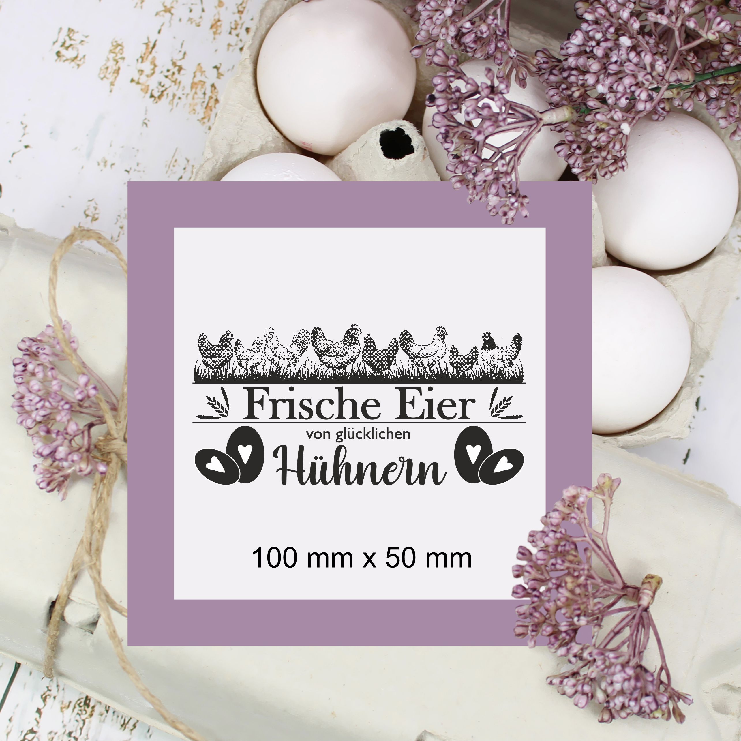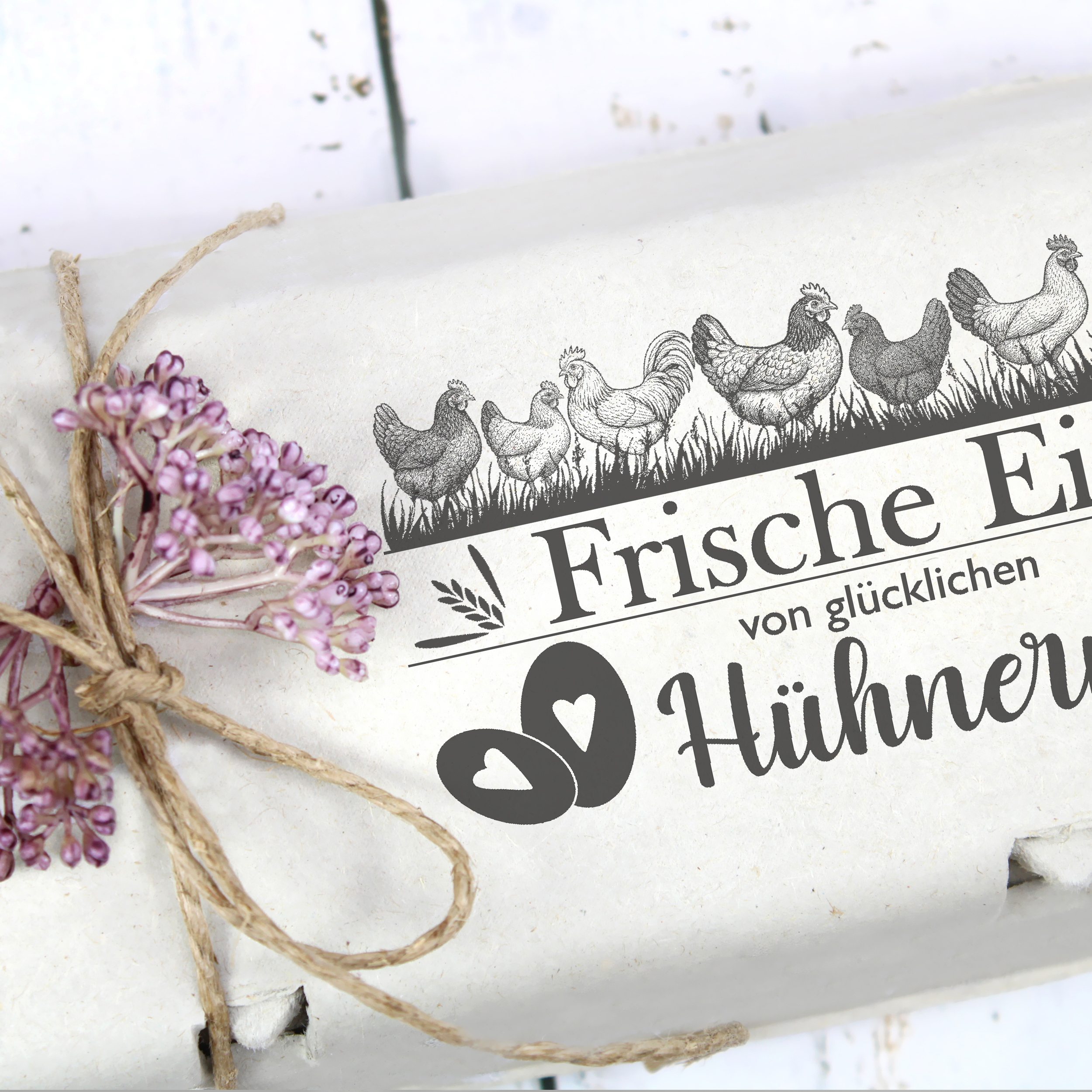 Stempel Frische Eier von glücklichen Hühnern - Hühner Holzstempel Eier Verpackung Motivstempel - Abdruck 100 x 50 mm