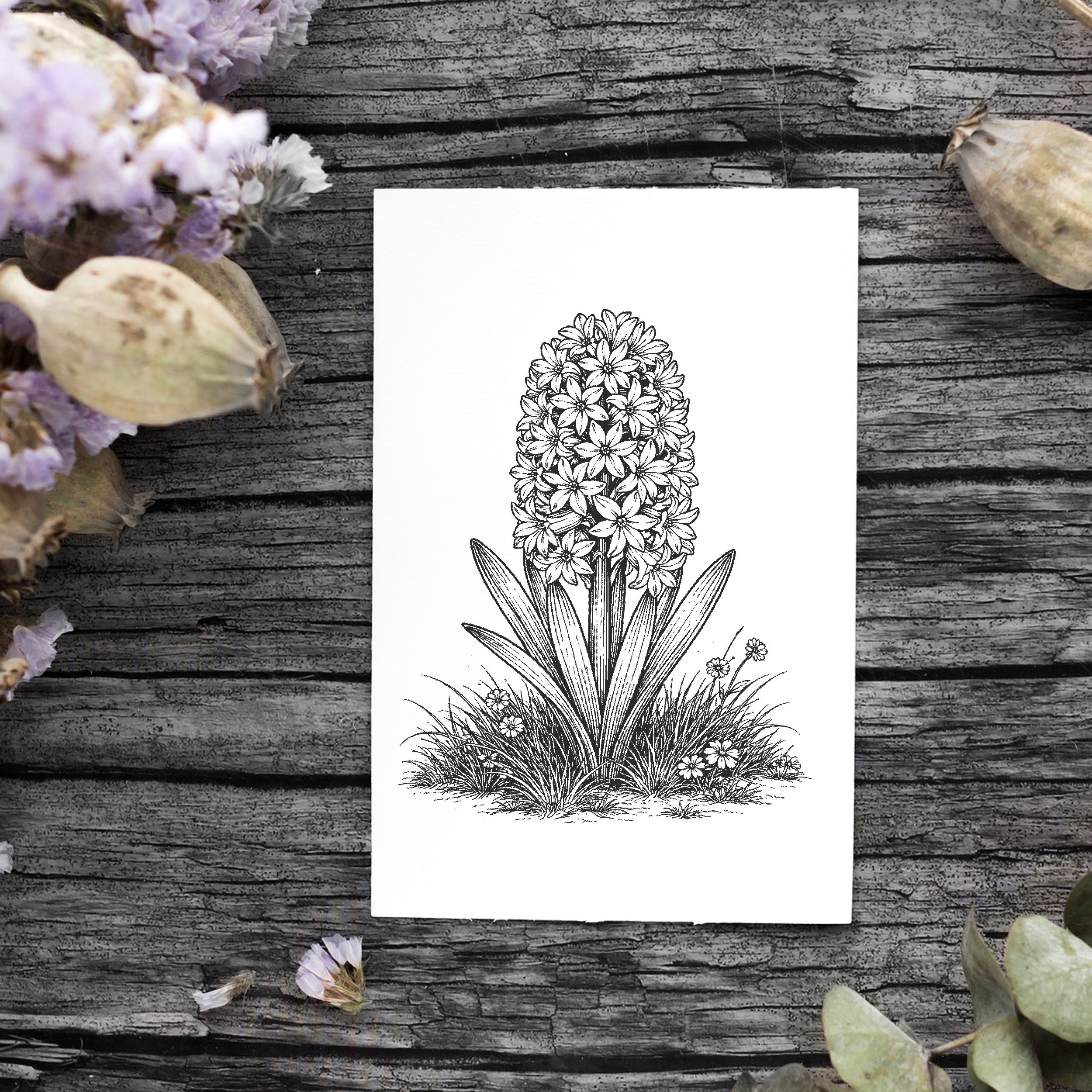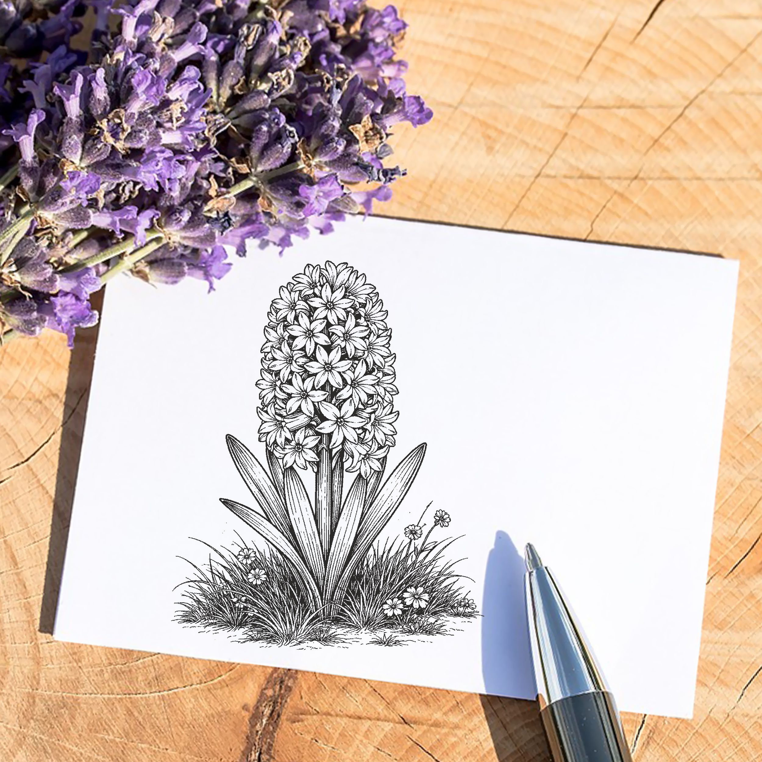 Detailreicher Motivstempel mit Hyazinthe: Dieser hochwertige Motivstempel mit Hyazinthe zeigt eine fein ausgearbeitete, botanische Illustration eines beliebten Frühblühers. Ideal für florale Designs, Gartenprojekte und natürliche Papeterie.