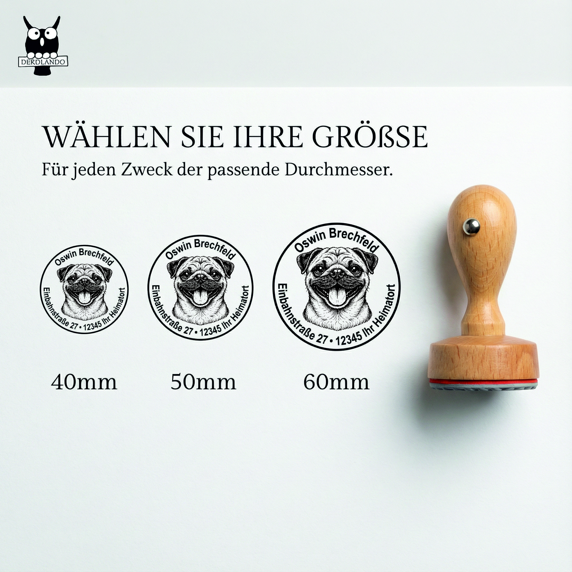 Stempel Mops personalisiert – Hund Holzstempel mit Name & Adresse