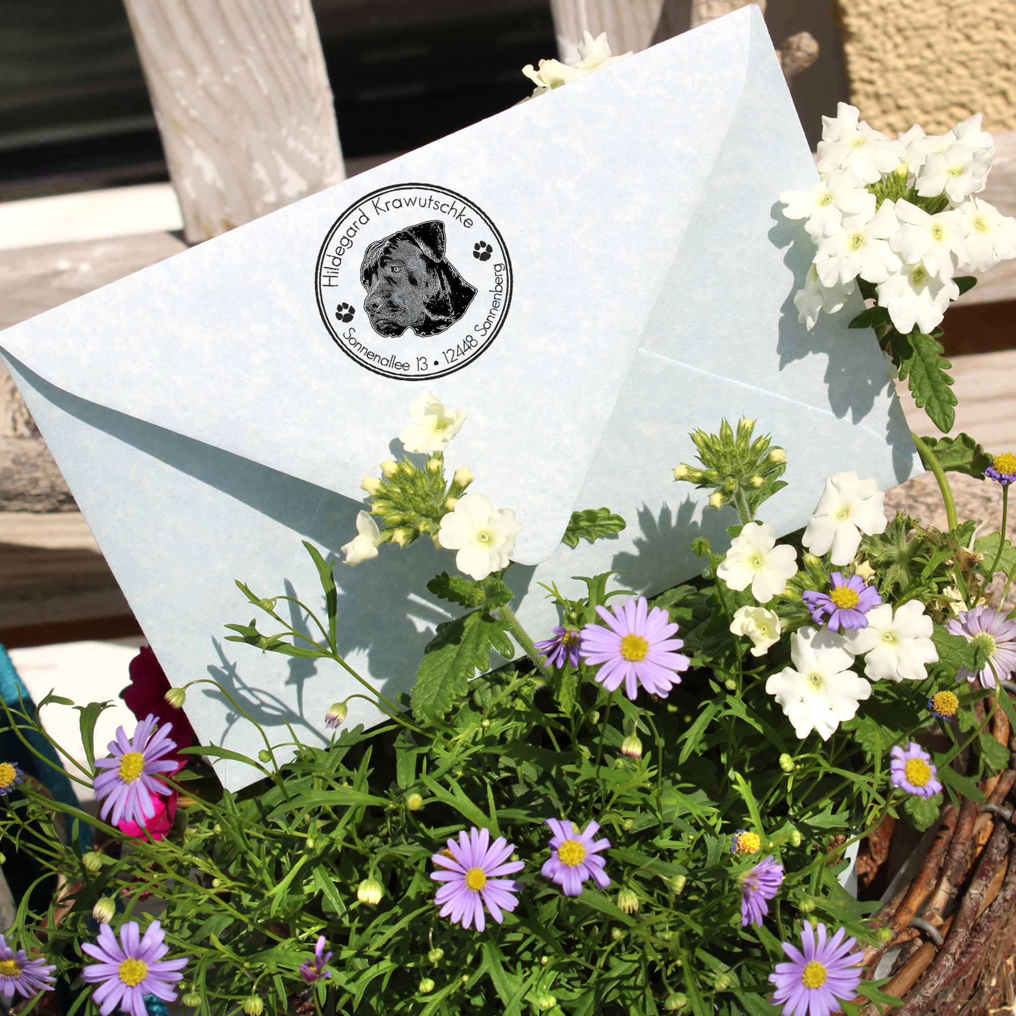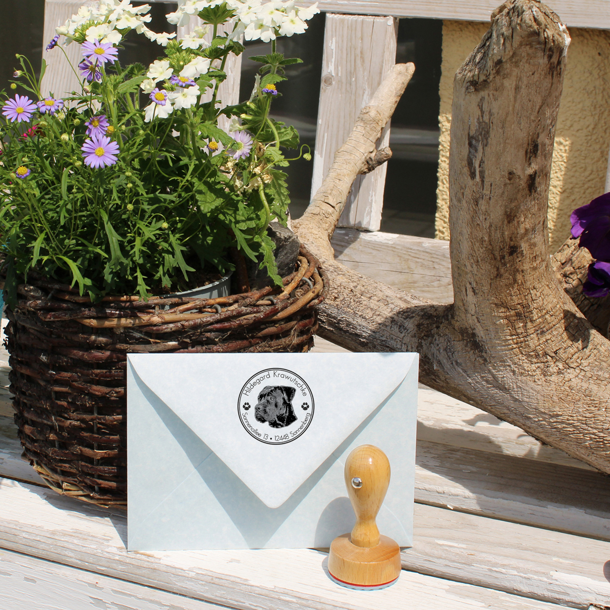 Unser runder Adressenstempel aus Holz mit einem süßen Hundemotiv ist die perfekte Lösung, um Ihre Post auf stilvolle Weise zu personalisieren. Dieser personalisierte Stempel ermöglicht es Ihnen, Ihre Adresse oder einen individuellen Wunschtext nach Ihren Wünschen anzupassen und sorgt so für einen einzigartigen Look Ihrer Briefe und Pakete.