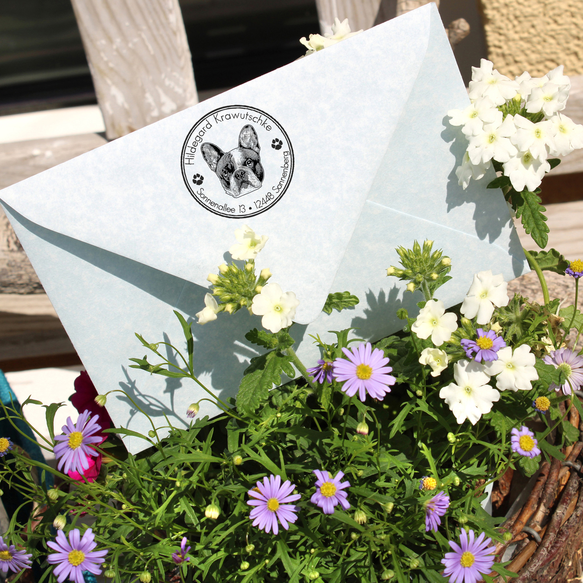 Stempel personalisiert Französische Bulldogge Hund Hunde rund 40mm Adressstempel Holzstempel