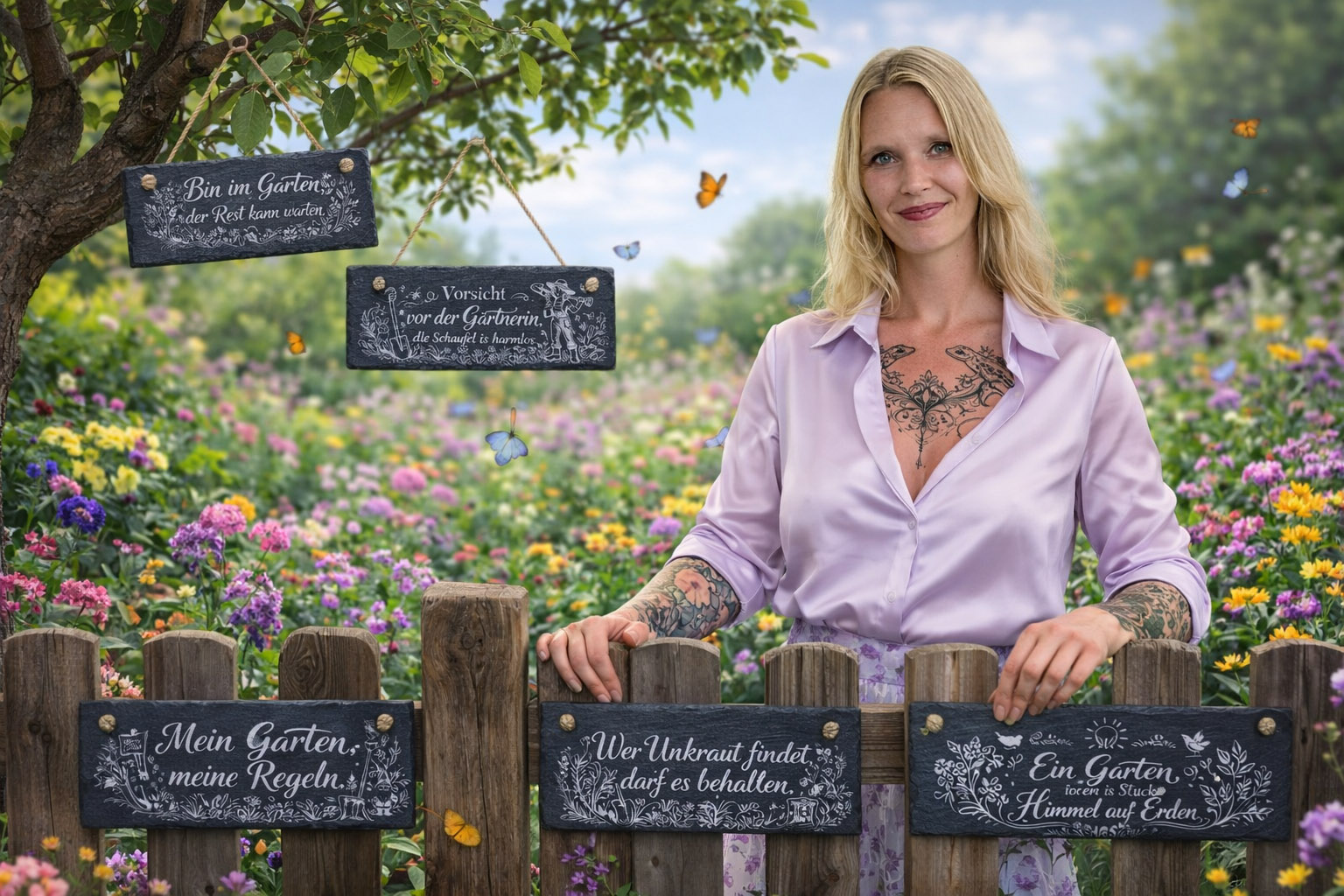 Die liebevoll gestalteten Gartensprüche werden von filigranen Gartenmotiven begleitet und verleihen jeder Tafel ihren ganz eigenen Charme. Ob am Gartenzaun, an einer Gartenhütte, im Blumenbeet oder an einem Baum aufgehängt – die dekorativen Schieferschilder sorgen überall für eine gemütliche und persönliche Atmosphäre.