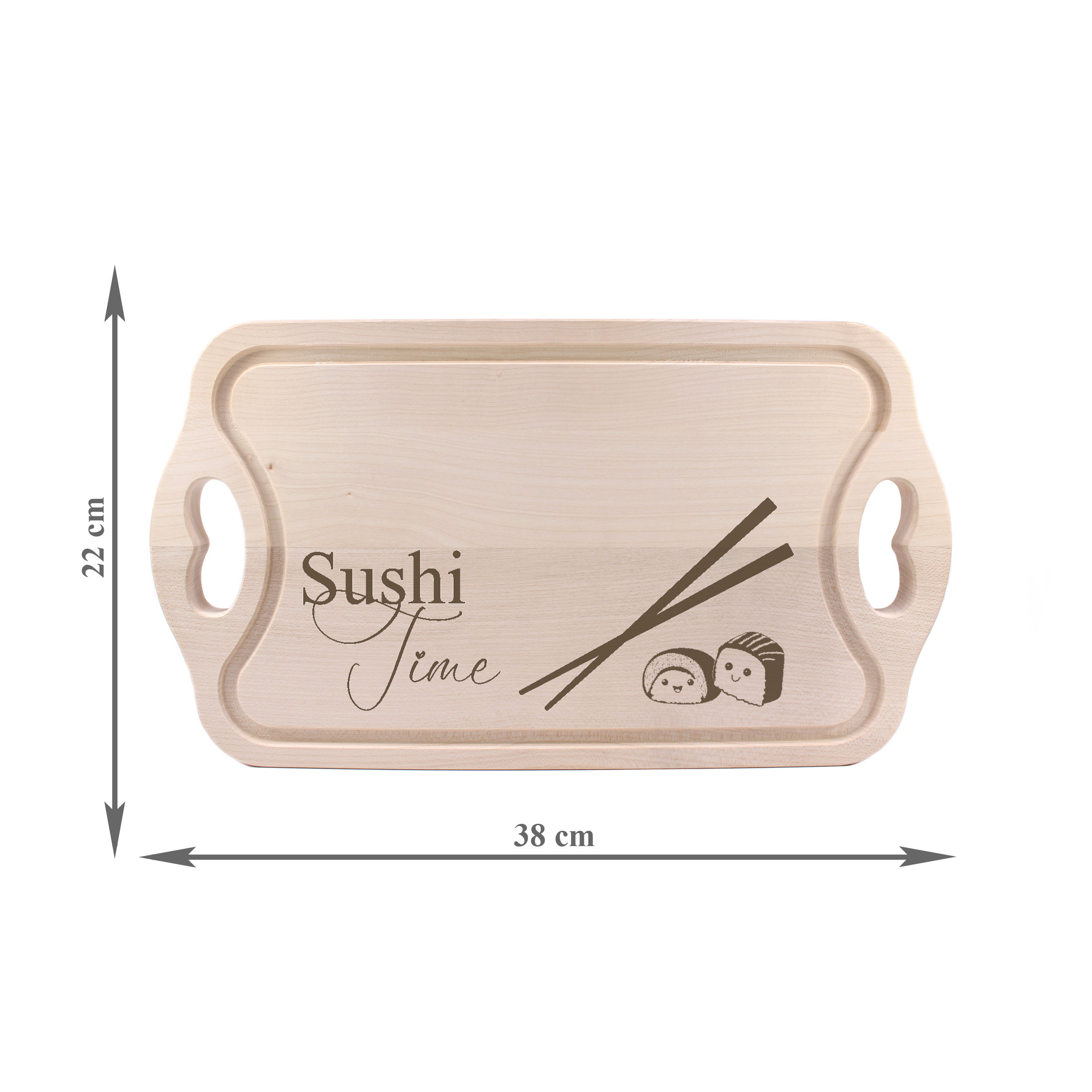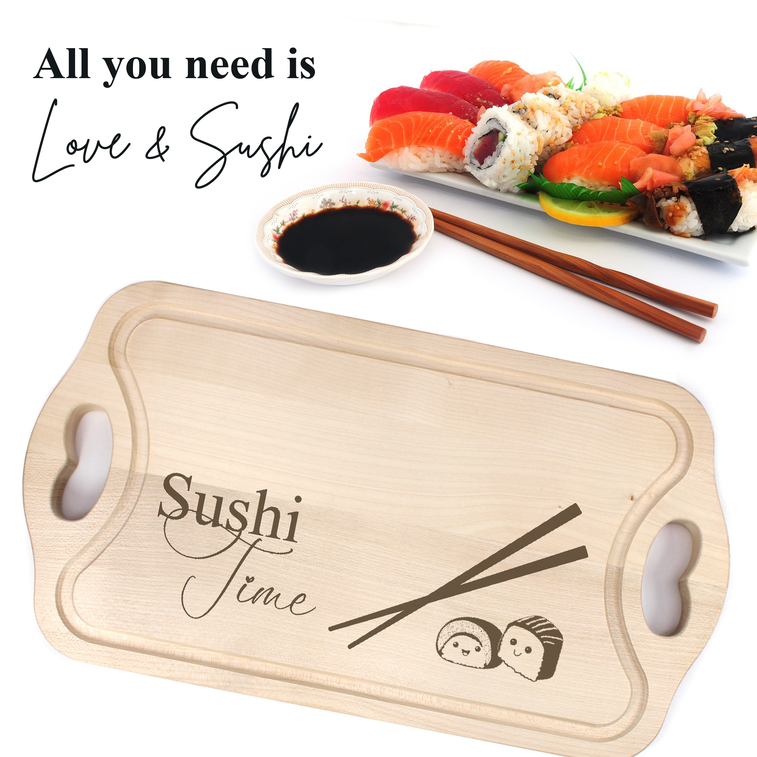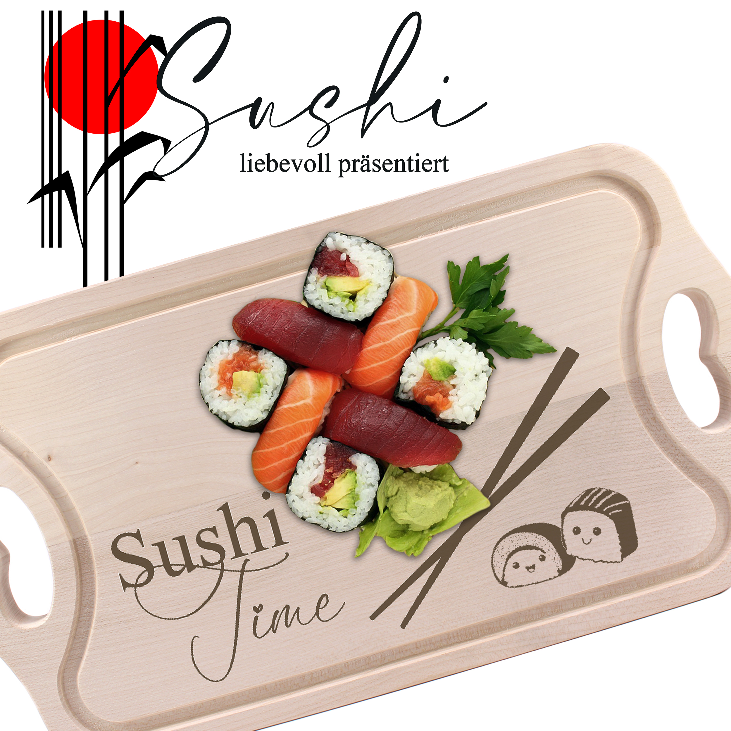 Sushi Brett aus Buchenholz graviert - Servierbrett Sushi Time mit Griffen - 38x22 cm
