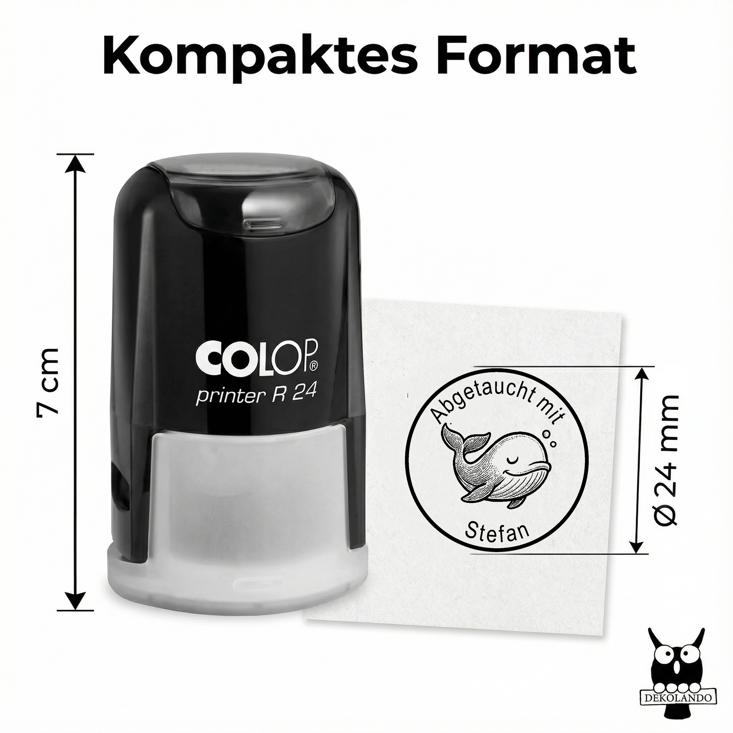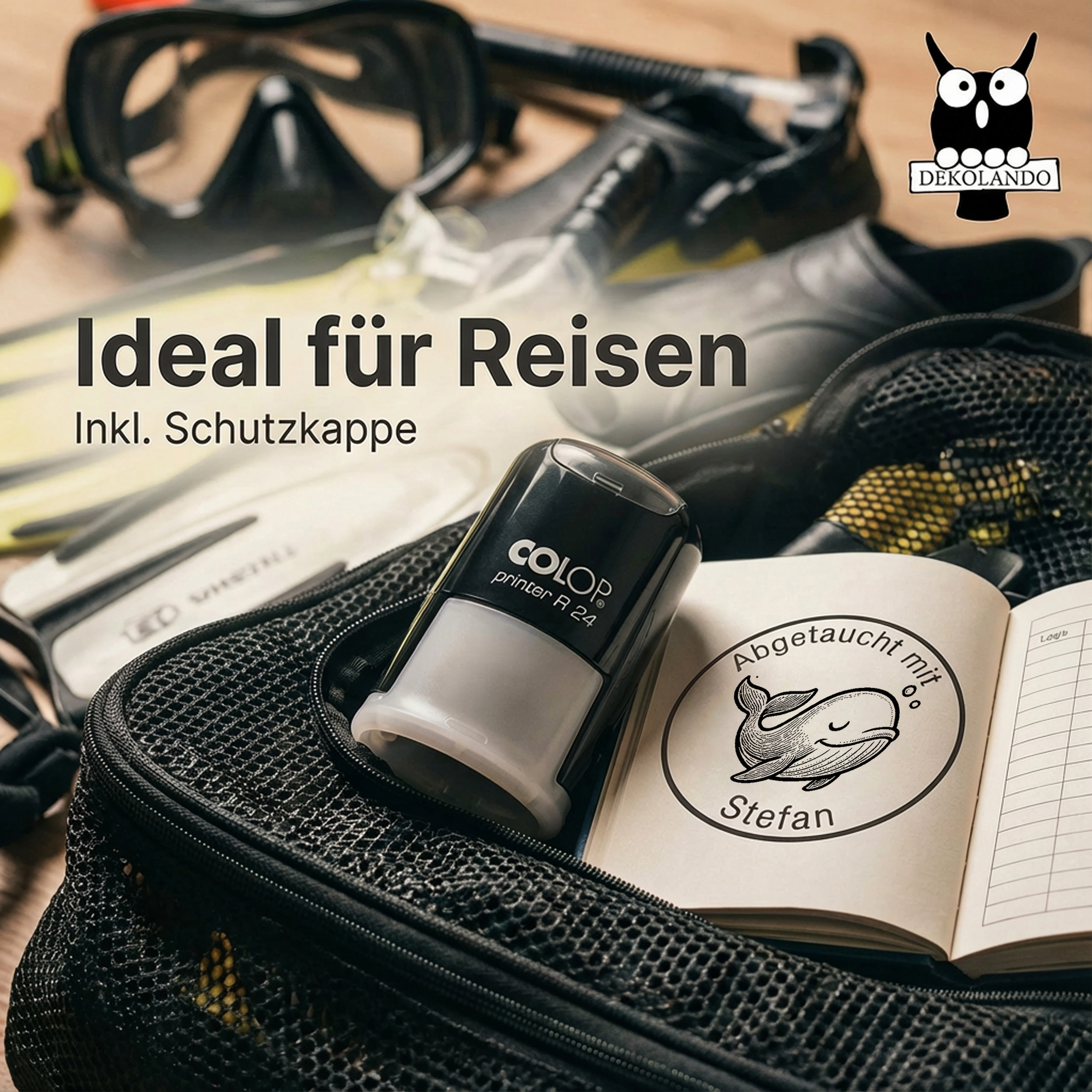 Der Stempel basiert auf dem hochwertigen Colop Printer R24 und bietet eine Abdruckgröße von rund 24 mm. Das klare Motiv und die schwarze Stempelfarbe sorgen für einen sauberen, scharfen Abdruck – perfekt für Logbuch, Kalender, Notizbuch oder individuelle Dive-Dokumentation. Dank des integrierten Stempelkissen ist der Stempel selbstfärbend und sofort einsatzbereit.