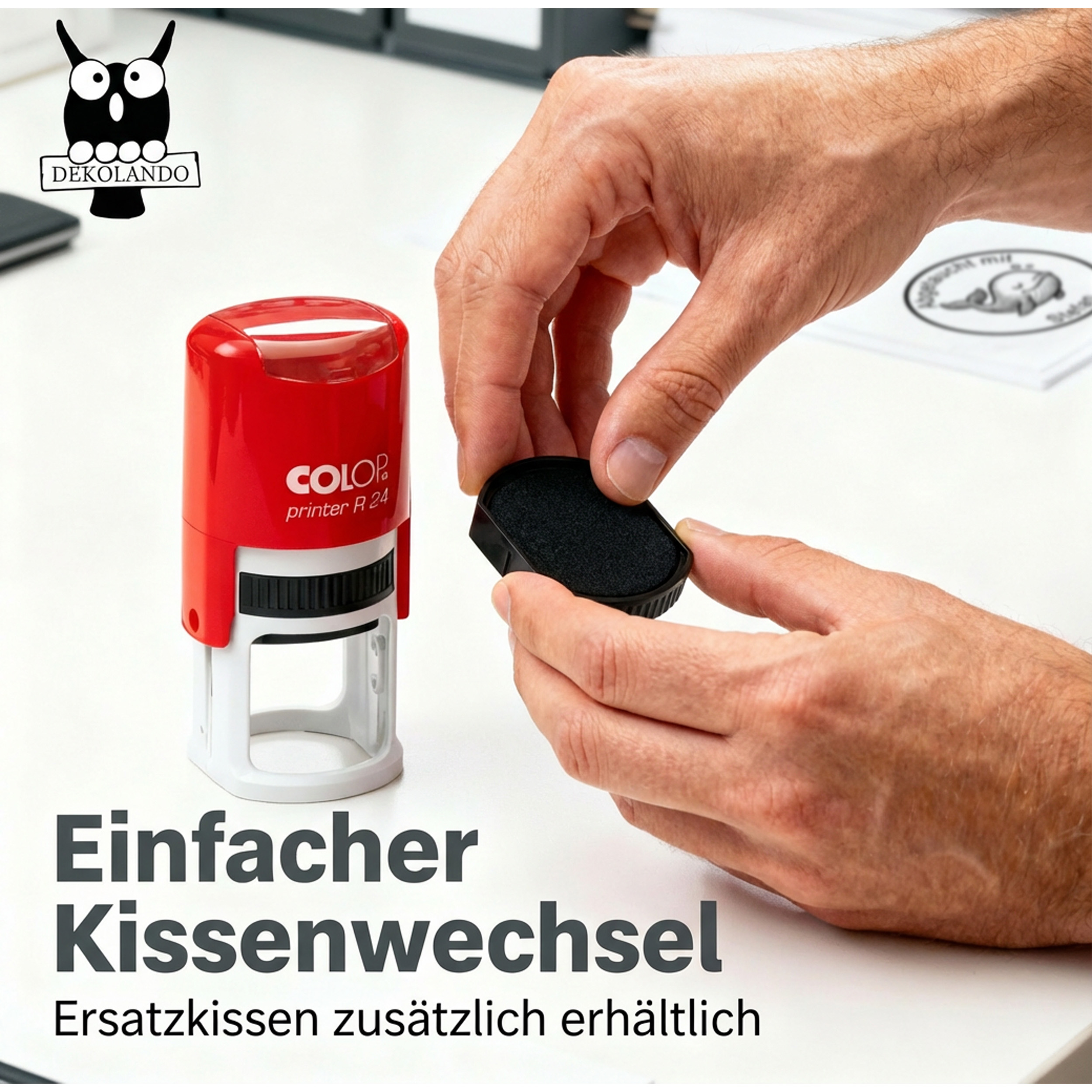 - Selbstfärbend & komfortabel – integriertes Stempelkissen, rundes Gehäuse, sauberer Abdruck, einfaches Kissenwechsel-System, Ersatzkissen separat bestellbar, ideal für häufige Einsätze.