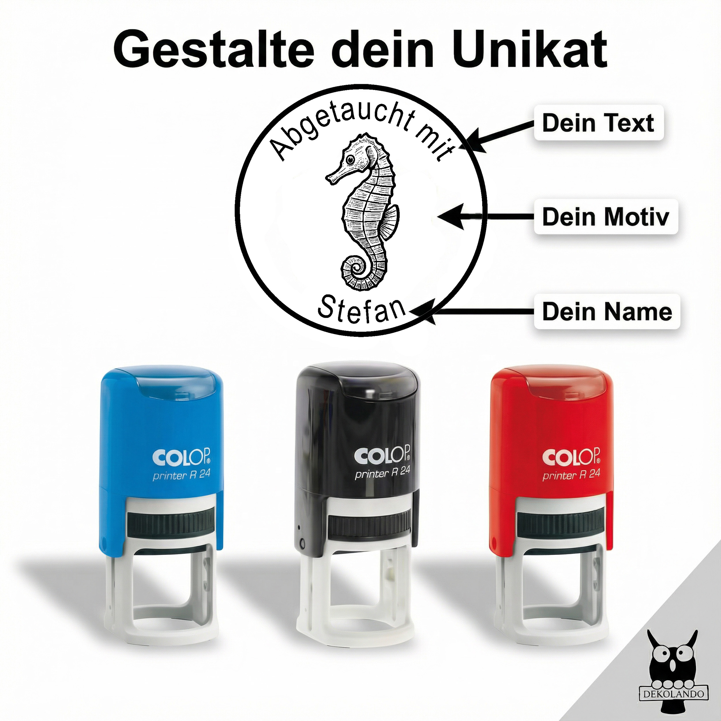 - Taucherstempel Seepferdchen 24x24 mm – personalisierte Stempel mit Name und Text, runder selbstfärbender Stempel für Taucherlogbuch, Tauch-logbuch, Tauchbuch & Dive Logbuch, perfektes Motiv für Taucher beim Tauchen.