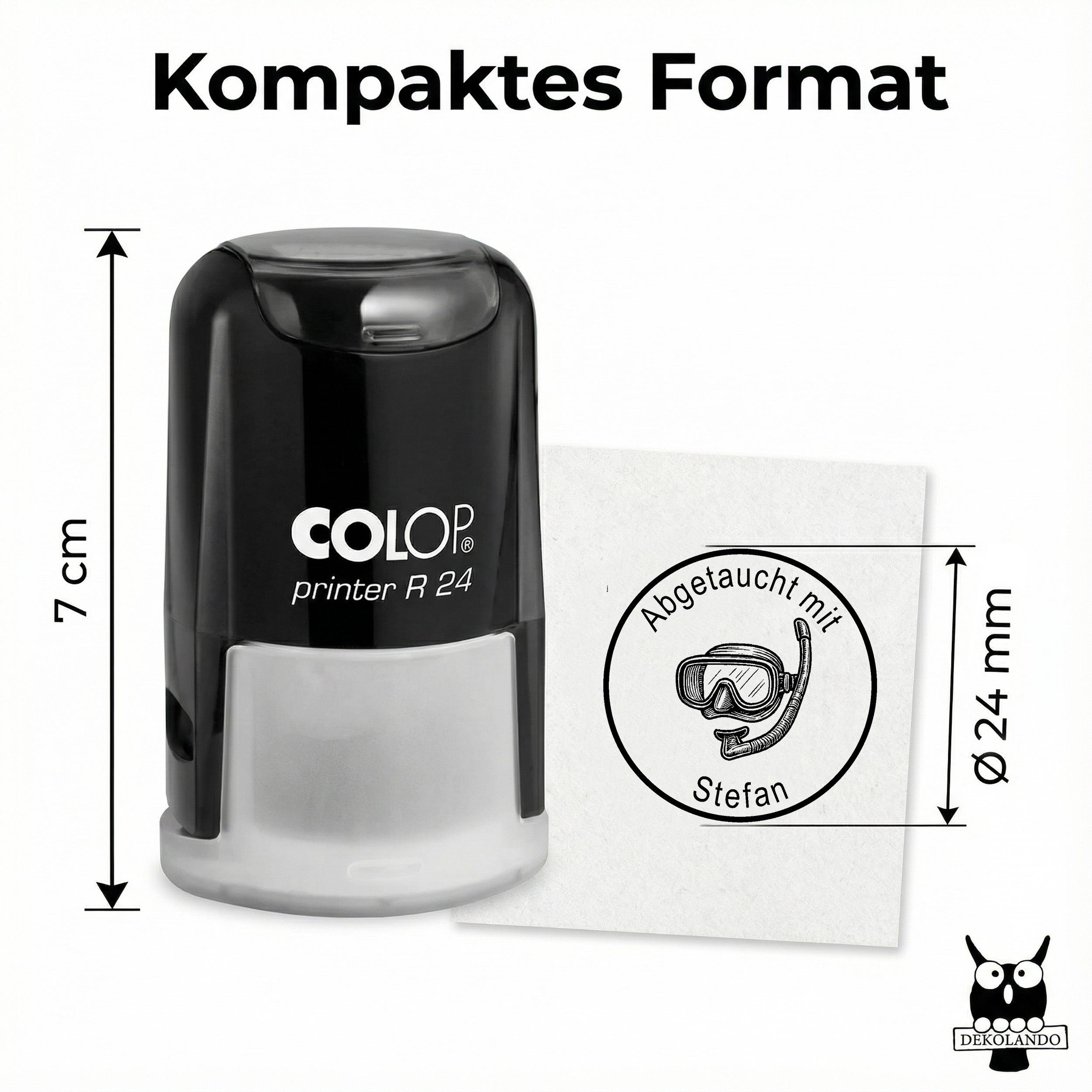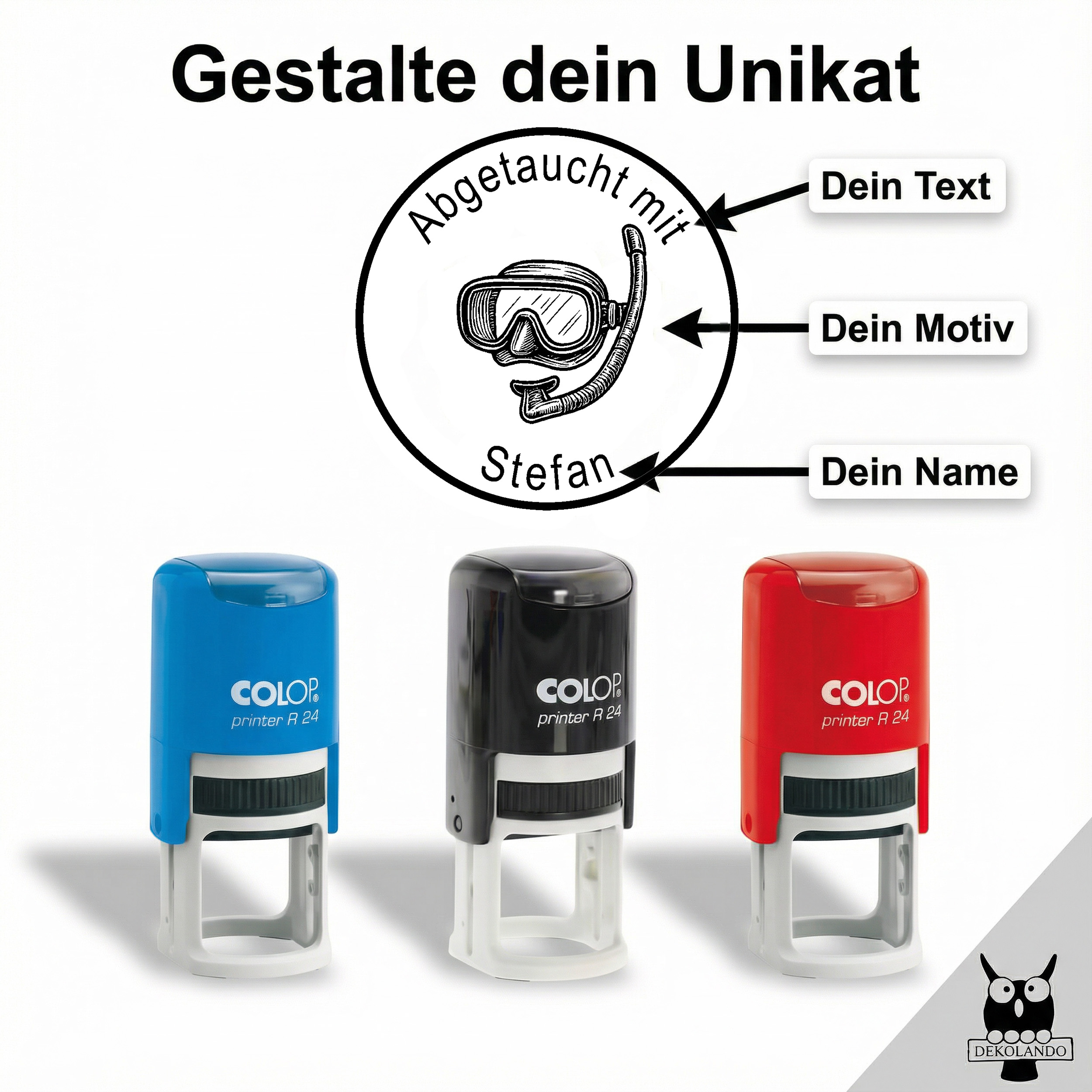 - Taucherstempel Taucherbrille Schnorchel 24x24 mm – personalisierte Stempel mit Name und Text, runder selbstfärbender Stempel für Taucherlogbuch, Tauch-logbuch, Tauchbuch & Dive Logbuch, perfektes Motiv für Taucher beim Tauchen.
