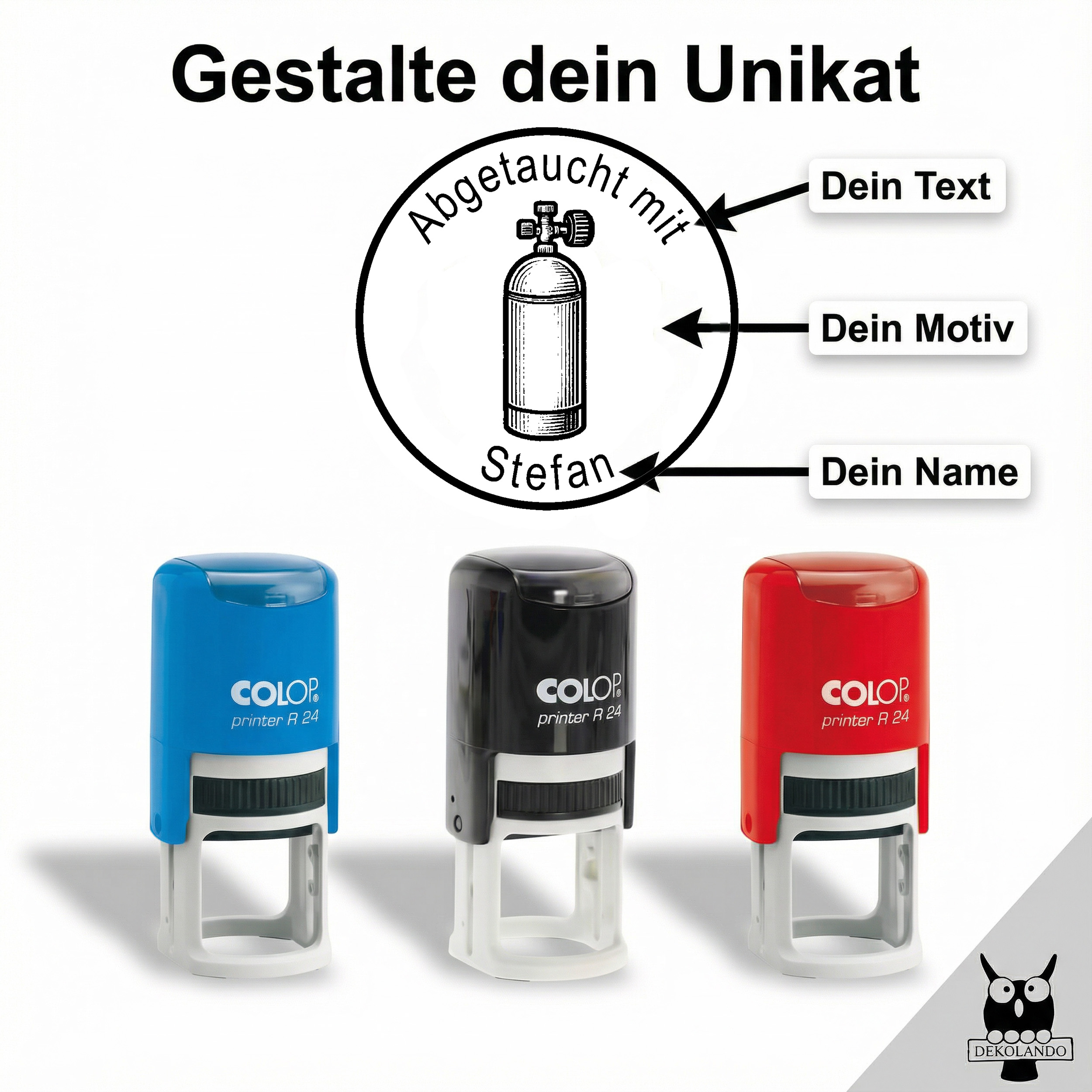 - Personalisierte Gestaltung – personalisiert rund mit Wunschtext oben und personalisierter Name unten, individueller Tauchstempel mit Motiv, ideal als persönlicher Stempel für dein Logbuch.