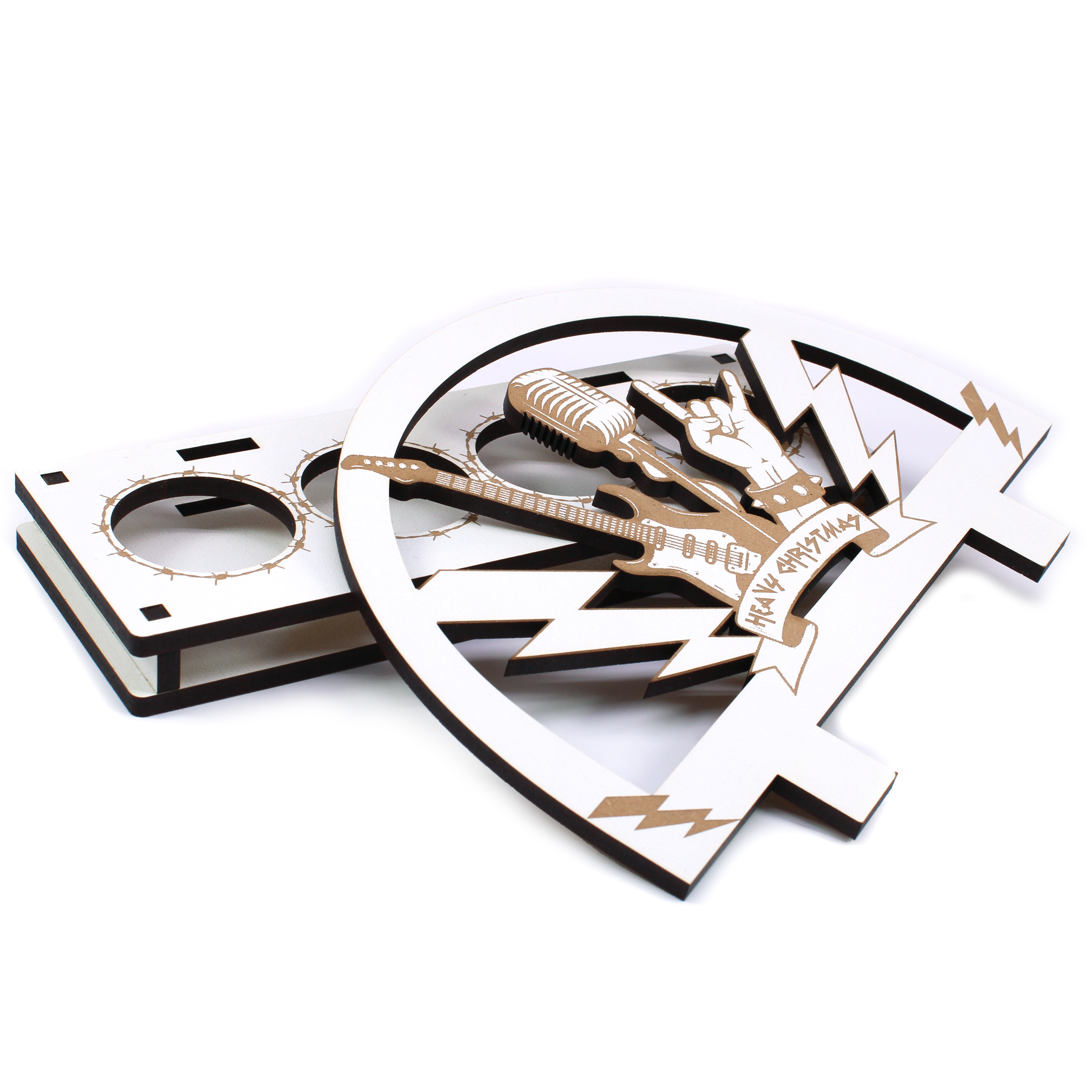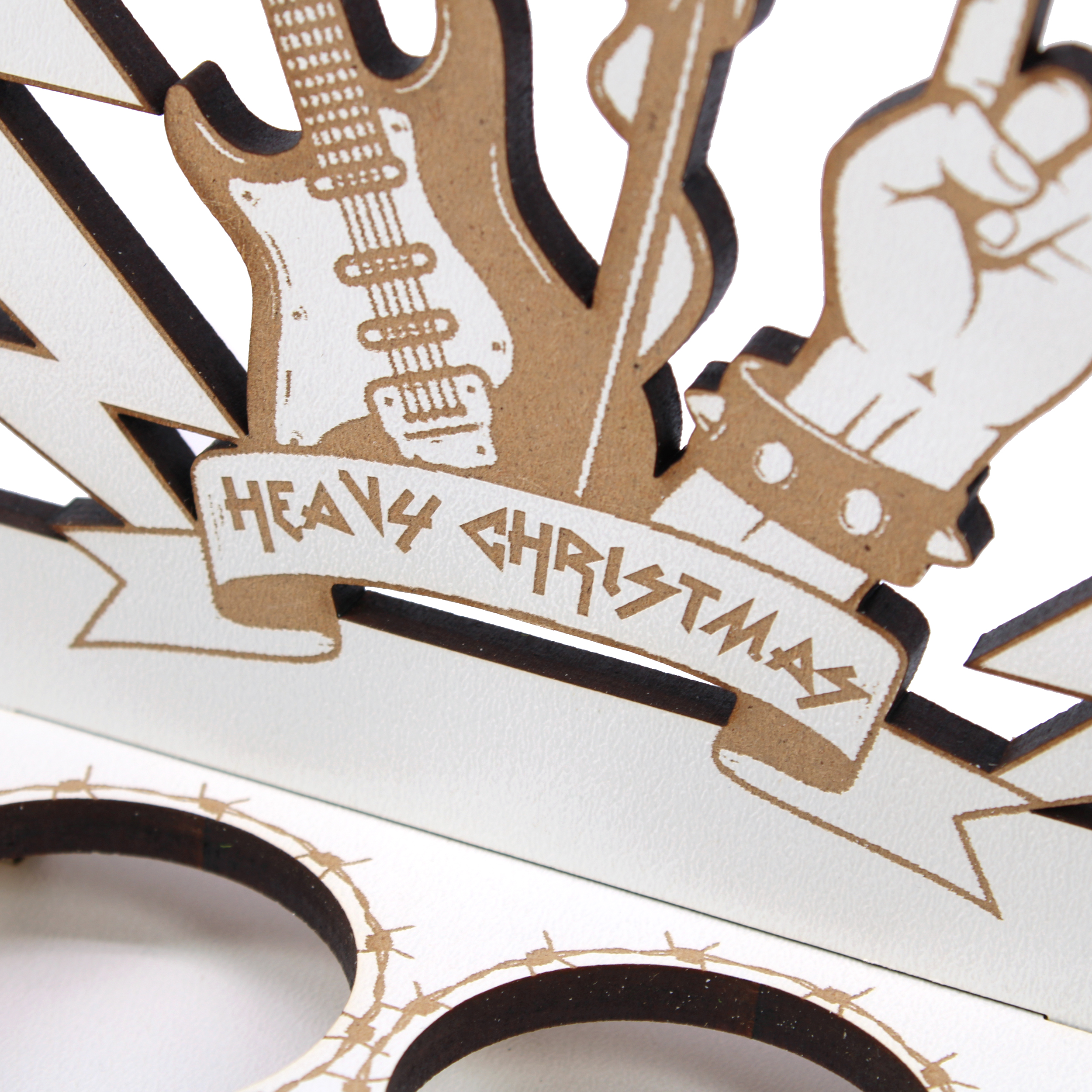 Der Dekolando Teelichthalter „Heavy Christmas“ bringt rockige Note in die Adventszeit. Als Adventskranz im Schwibbogen-Design bietet er Platz für vier Teelichter und verbindet festliche Winterstimmung mit Rock’n’Roll-Attitüde. Gefertigt aus hochwertigem HDF überzeugt der Aufsteller mit einer präzisen, warm braunen CO₂-Lasergravur, die den Heavy-Look edel in Szene setzt.
