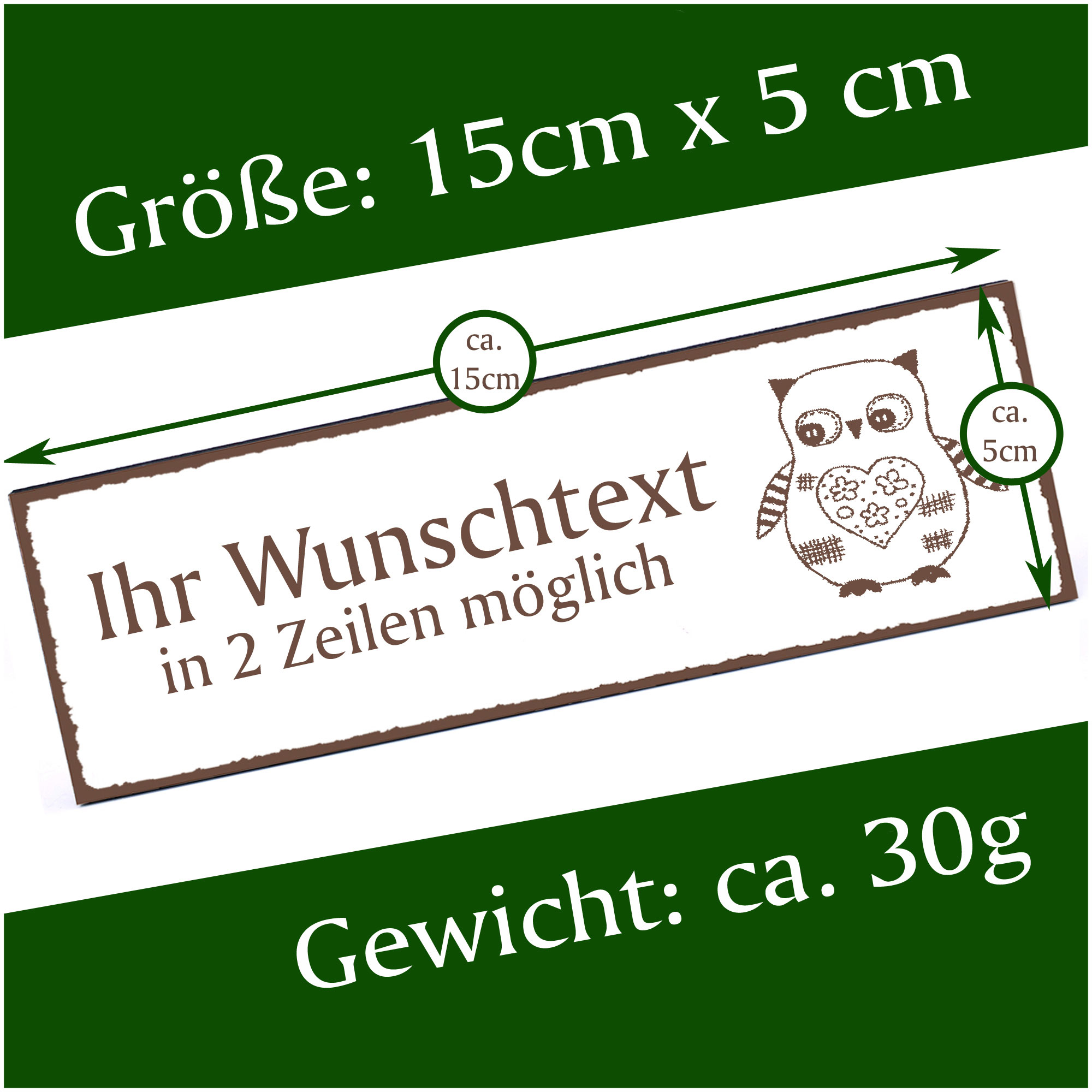 - HOLZSCHILD: Das Türschild ist ca. 150mm x 50mm groß. Das HDF Holz hat eine Stärke von 5mm. Insgesamt wiegt das Schild ca. 30g. Bitte vor Feuchtigkeit schützen